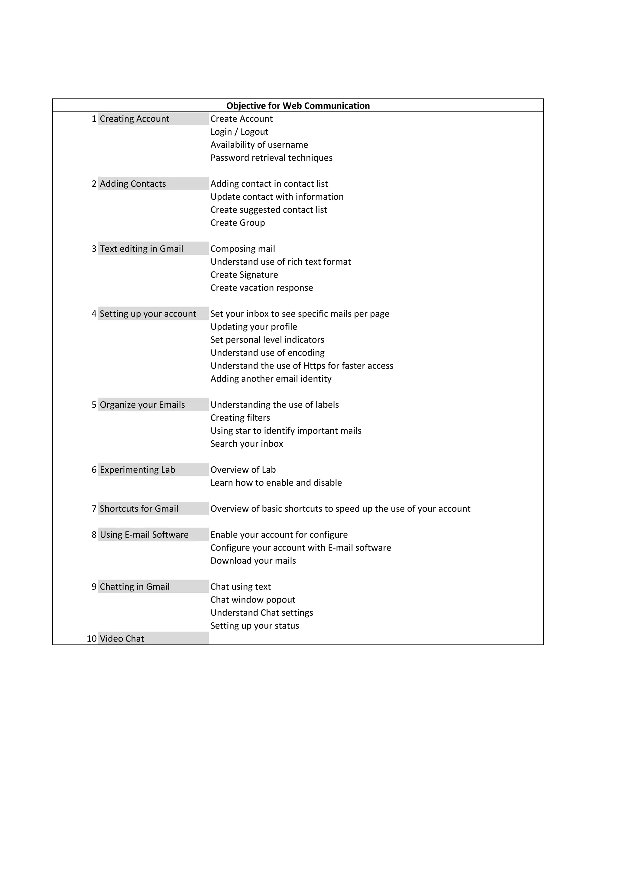 This document outlines features for communicating via web and email, including creating an account, adding contacts and organizing emails with labels and filters. It also covers composing and formatting emails, customizing account settings, using chat and video chat features, and configuring an email account with software. The goal is to teach users how to effectively set up and utilize key functions for web-based communication via Gmail.