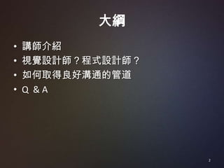 本文探讨了视觉设计师与程序员之间的合作关系,强调良好沟通的重要性以及怎样建立有效的沟通渠道。讲师介绍了自身背景,并提供了关于如何尊重各自专业、通过故事讲述来促进理解的建议。最后,呼吁各方共同努力以解决问题,并实现更好的合作。