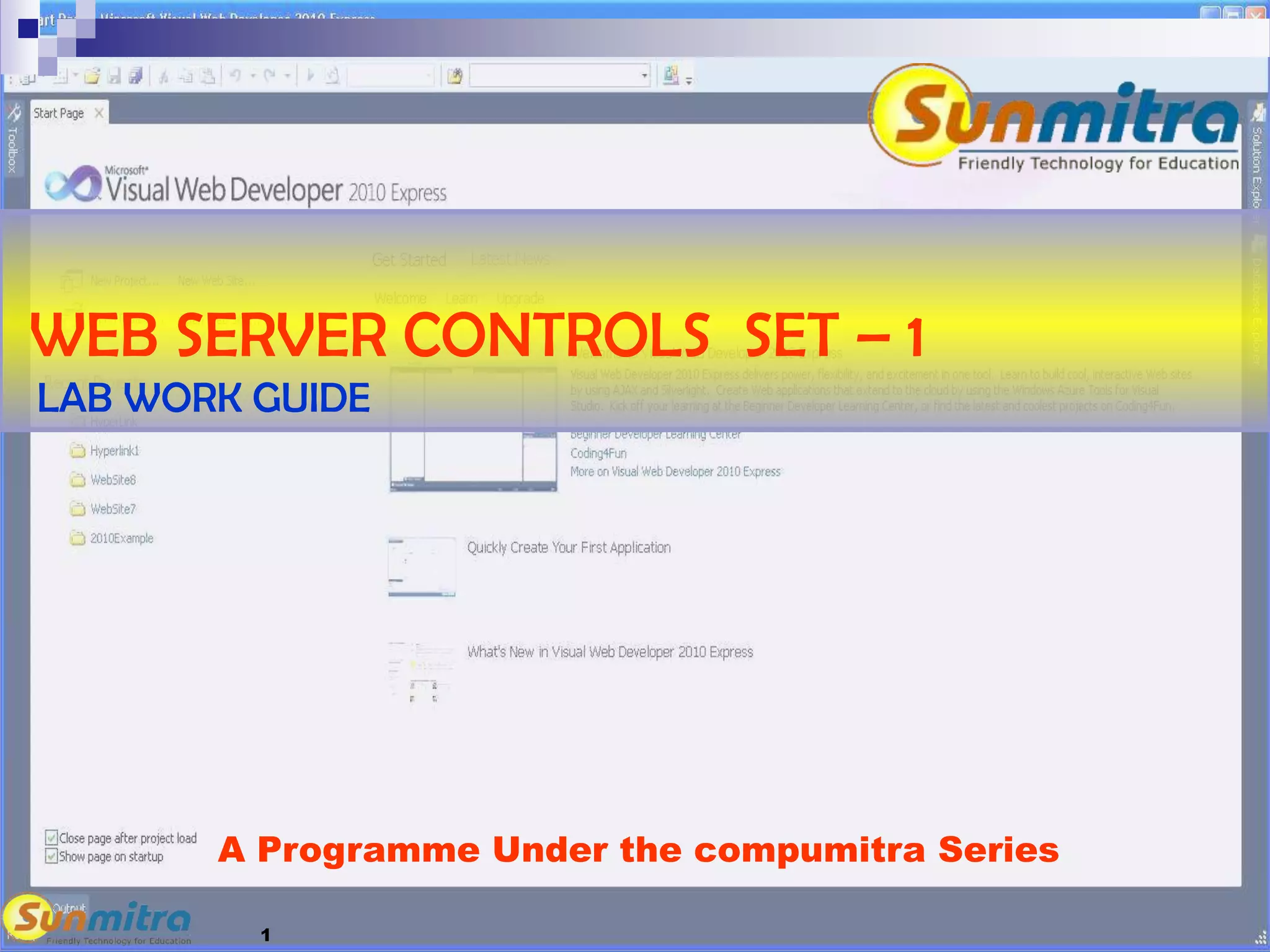 This document provides instructions for creating and modifying an ASP:HyperLink web server control. It explains how to create a new web form, copy code for a hyperlink control into the form, and view the output. It then demonstrates how to modify properties of the hyperlink like font size and style, image URL, navigation URL, and tooltips. The document encourages sharing this information and visiting the Sunmitra website for more programming guides.