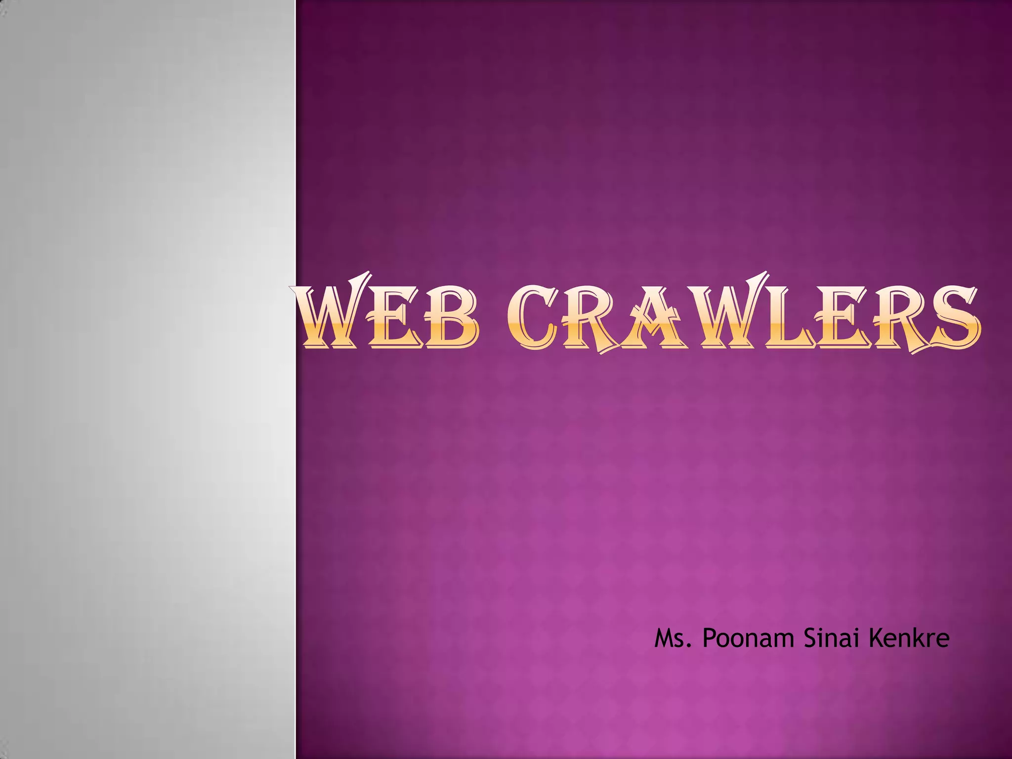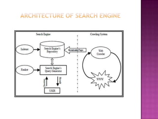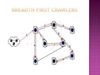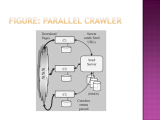 The document discusses web crawlers, which are programs that download web pages to help search engines index websites. It explains that crawlers use strategies like breadth-first search and depth-first search to systematically crawl the web. The architecture of crawlers includes components like the URL frontier, DNS lookup, and parsing pages to extract links. Crawling policies determine which pages to download and when to revisit pages. Distributed crawling improves efficiency by using multiple coordinated crawlers.