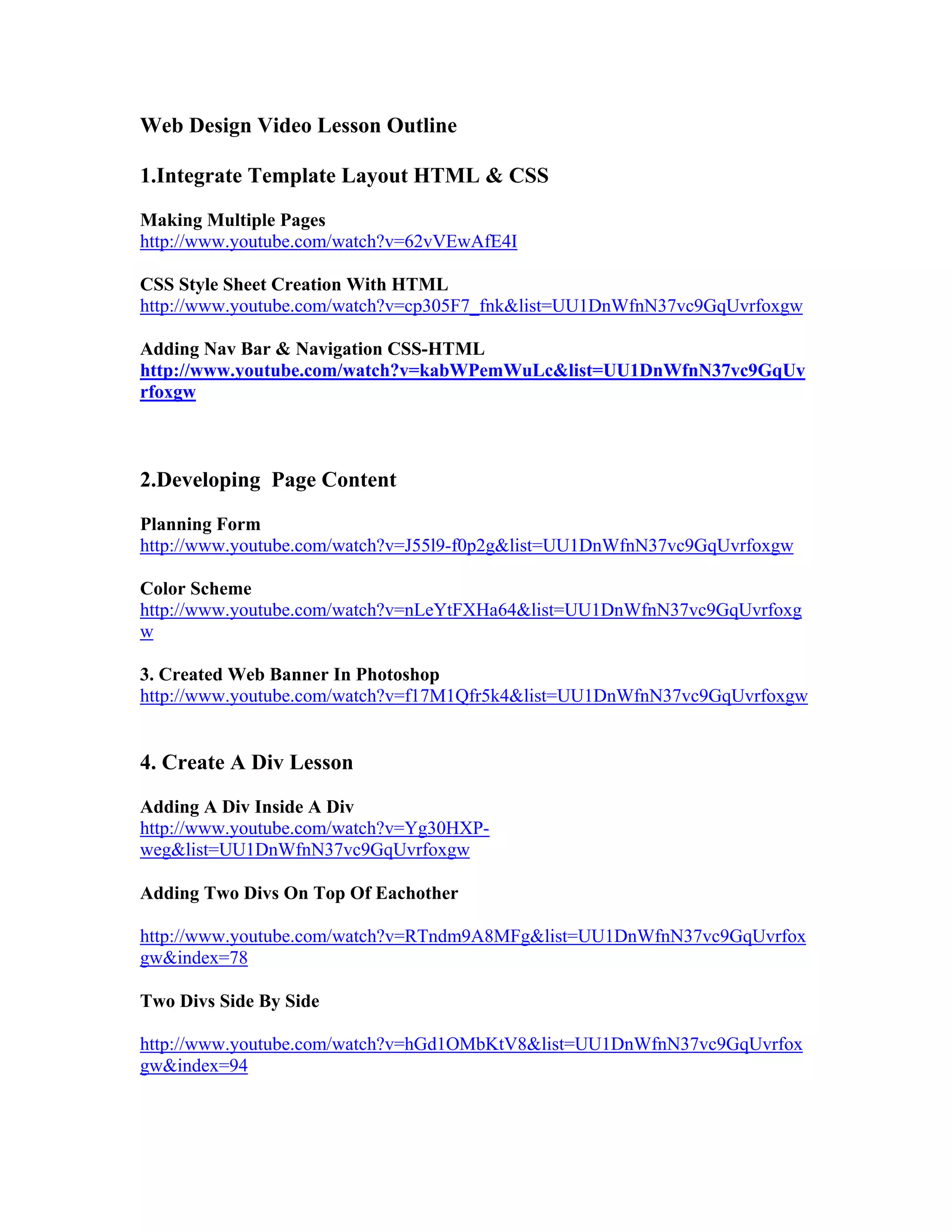 The document outlines a web design video lesson plan consisting of several parts: 1) integrating template layouts and adding navigation bars using HTML and CSS, 2) developing page content like forms and color schemes, 3) creating a web banner in Photoshop, 4) lessons on adding and styling divs, and 5) tutorials on navigation bars and CSS text tools. It also includes additional resources on fonts, layouts, code checkers, HTML5 tools, and mobile development.