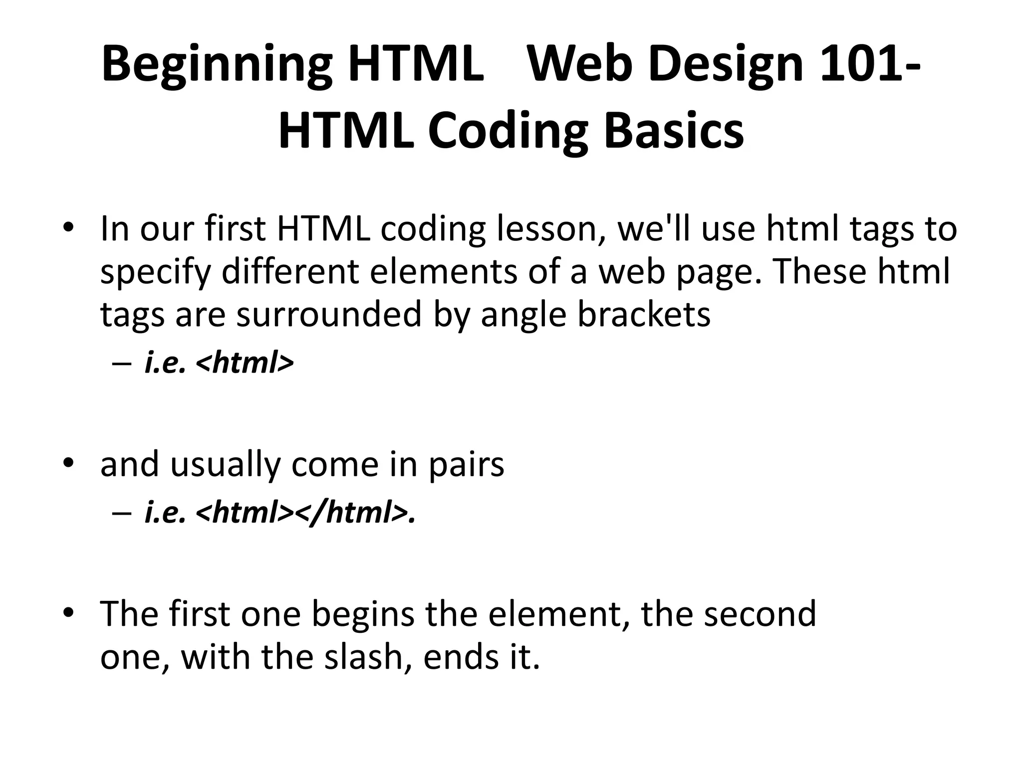 This document provides instructions for writing basic HTML code. It explains that HTML code uses tags surrounded by angle brackets to specify different elements of a web page, with opening and closing tags. It then gives step-by-step instructions for creating a simple HTML file with tags for the html, head, title, and body elements and displaying it in a browser. It also describes the purpose of these main tags.
