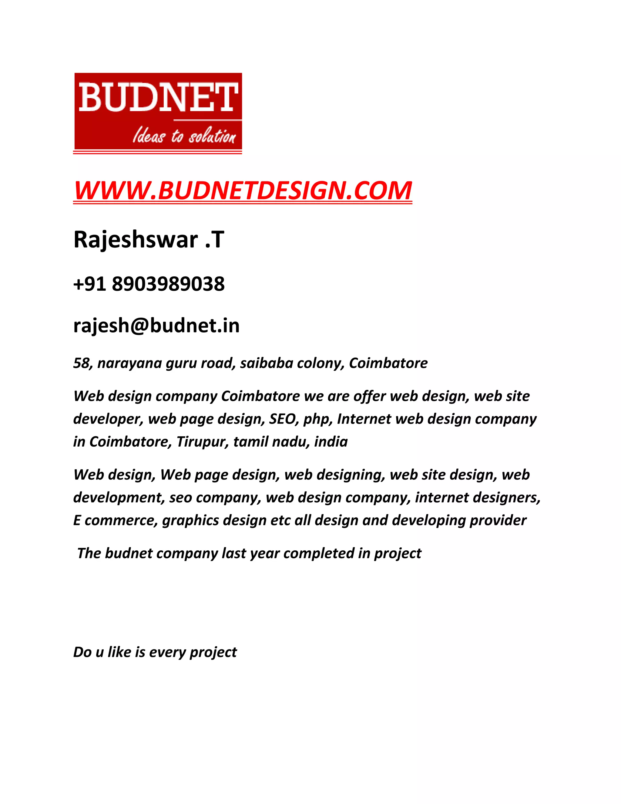 Budnet Design is a web design company based in Coimbatore, Tamil Nadu, offering services such as web design, development, SEO, and graphic design. They cater to clients in Coimbatore, Tirupur, and across India. The company prides itself on completing projects to client satisfaction.