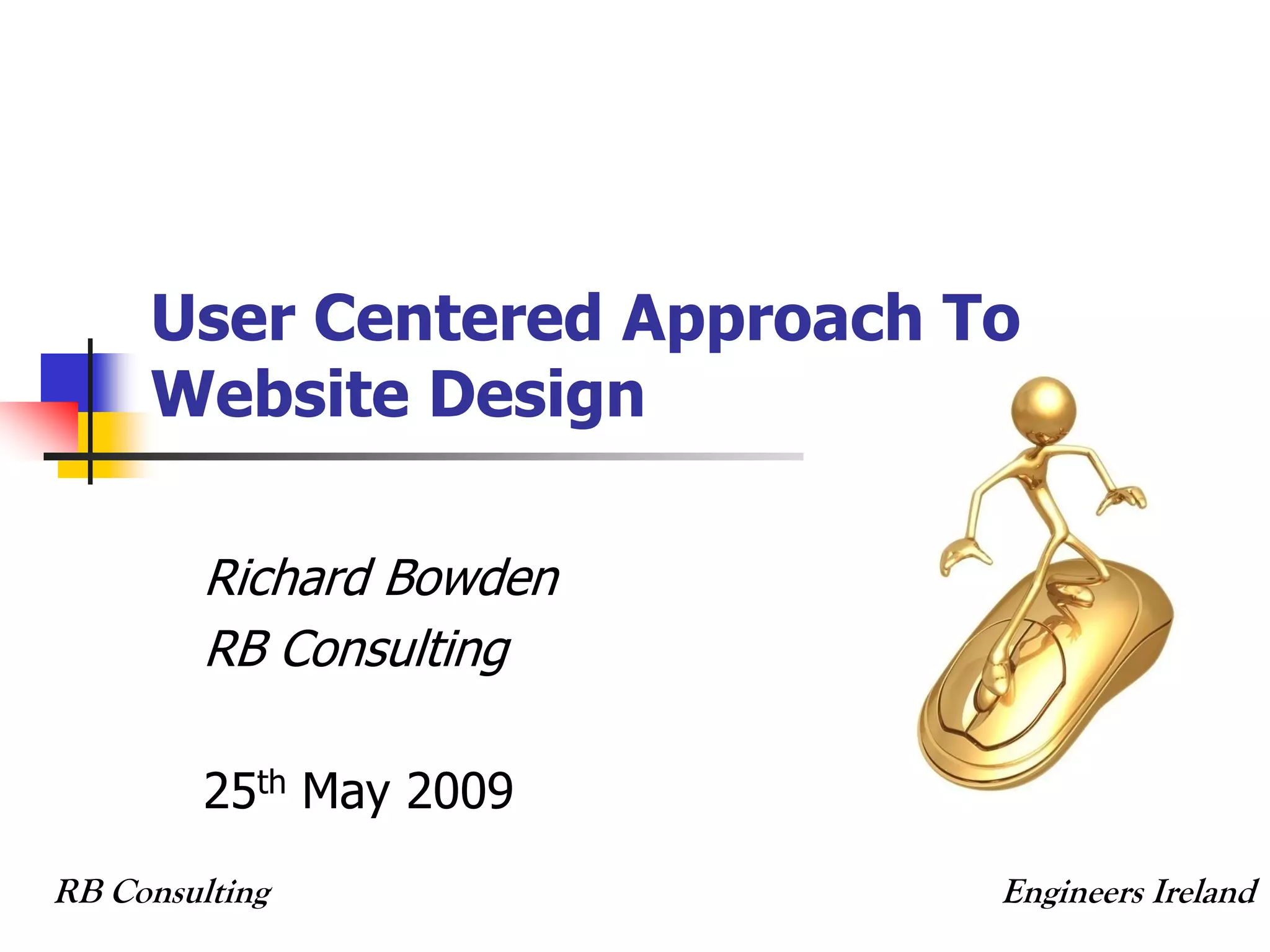 The document discusses a user centered approach to website design. It covers principles of usability, usefulness and accessibility in web design. It emphasizes involving users throughout the design process to understand their needs and goals. This includes tools like storyboarding, persona analysis and wireframes. An agile development approach is recommended to allow flexibility in adapting the design based on user research and feedback. The document also briefly touches on open versus proprietary technologies.