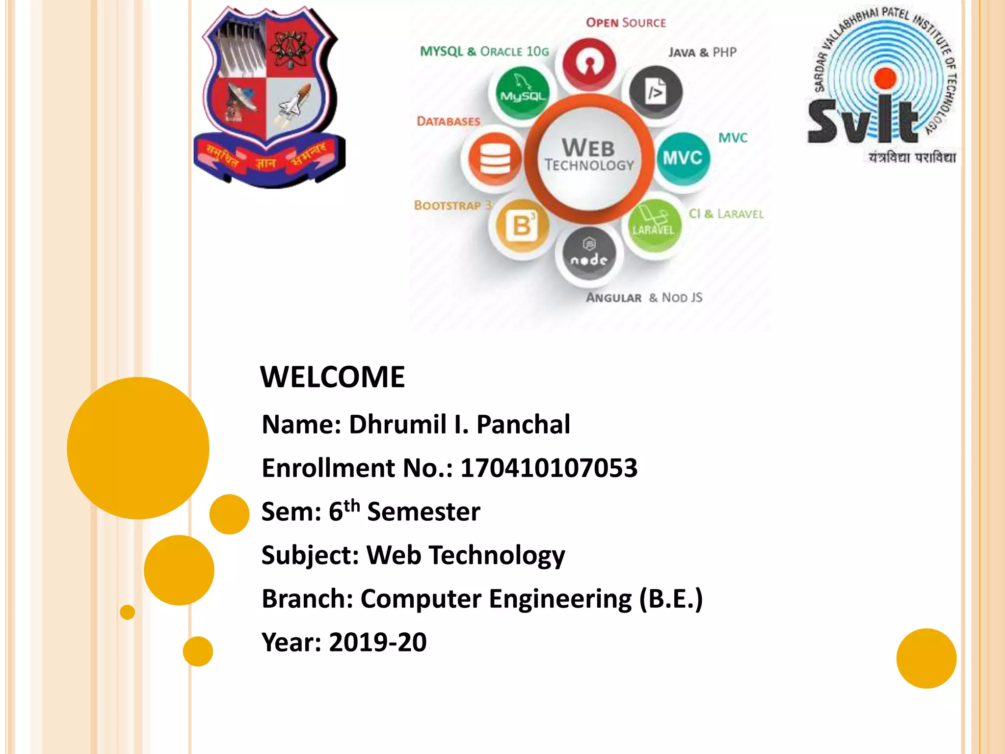 This document provides information about Dhrumil I. Panchal, a 6th semester computer engineering student at seminar on web design issues. It discusses key topics in web design like display resolution, look and feel, and page layout and linking. Specifically, it notes the importance of display resolution in web design and provides options for addressing different resolutions. It also defines look and feel as the overall visual appearance of a website, including themes, typography, graphics, structure and navigation. Finally, it describes how page layout and linking are used to structure information and connect pages within a website.