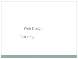 The document provides instructions for various web design tasks in lesson 3, including adding links within pages and to external pages, inserting images and adding alternative text descriptions, using images as links, creating image maps with hotspots, and adding rollover images using two images of the same size. Students are tasked with creating a webpage featuring rollover images and an image map, and uploading it, as well as a welcome/introduction homepage page with links to previous work, other sites, and interactive buttons using rollover images.