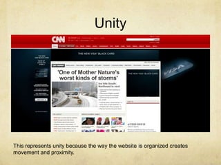 This document discusses 7 principles of web design: unity, variety, balance, scale and proportion, rhythm, emphasis, and simplicity. It provides examples of websites that demonstrate each principle, such as Yahoo using variety with many colors, shapes and tabs, and Twitter employing simplicity with a direct log in screen without overwhelming information.