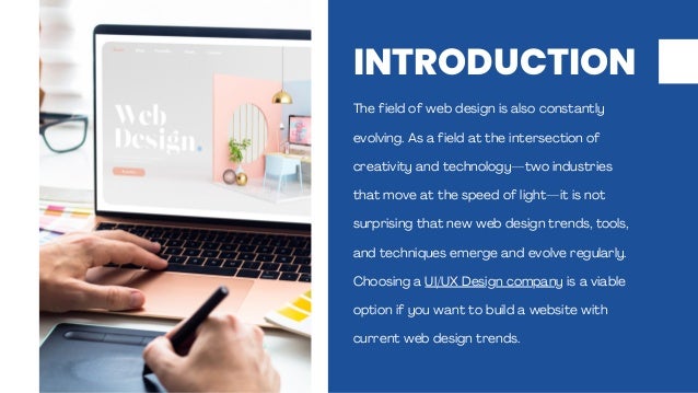 The document discusses the evolving field of web design, highlighting key trends for 2022 that enhance brand visibility and user experience. Notable trends include the use of videos, interactive fonts, split-screen layouts, and inclusive design. Emphasizing creativity and technology, the piece advocates for a fresh approach to web design that captivates users and stands out in the market.