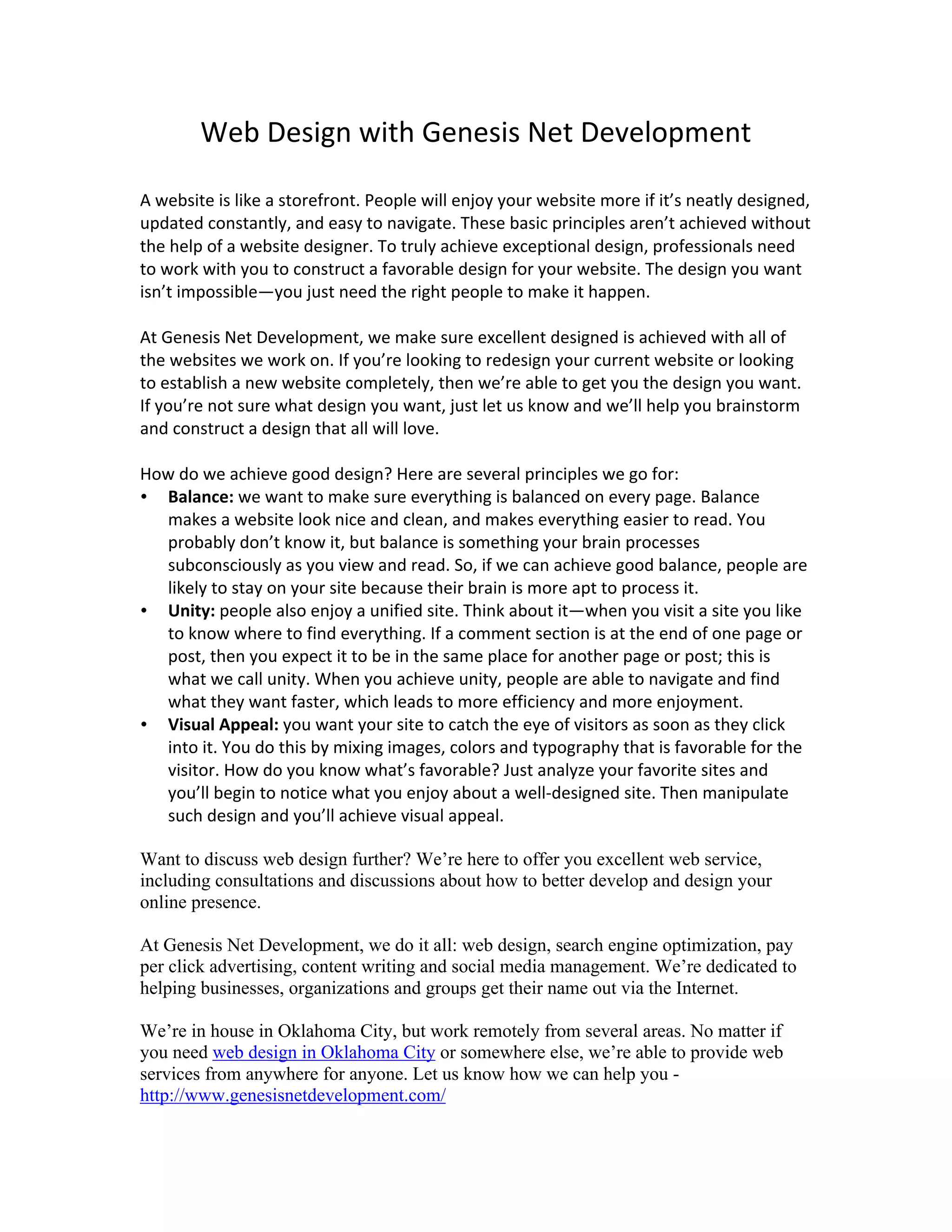 The document discusses web design principles from Genesis Net Development. It states that a well-designed, easy to navigate website is important for user enjoyment. Genesis Net aims to achieve excellent design on all websites it works on by following principles like balance, unity, and visual appeal. These principles help users process and navigate websites more efficiently. The company offers full-service web design and development to help businesses promote their online presence.