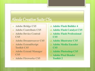 The document lists Microsoft Office 2010 applications including Word, Excel and PowerPoint. It also lists Adobe Creative Suite CS5 applications such as Photoshop, Illustrator, Dreamweaver and Fireworks. It discusses the best operating system comparing Windows 7 and Mac OS, noting advantages of each. It also provides basic programs for designing a website, listing HTML, XHTML and CSS.
