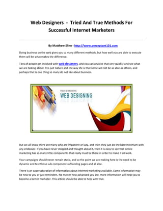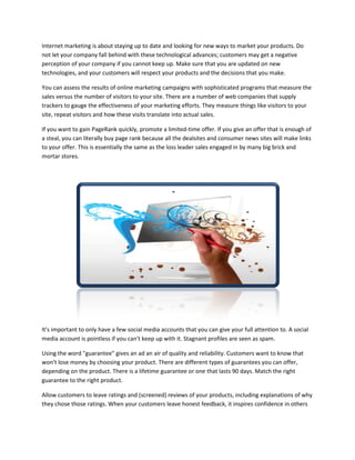 This document provides tips and advice for successful internet marketing. It emphasizes the importance of staying up-to-date with new technologies and testing different marketing strategies and components of websites. Customers want reliable companies that protect their privacy and value their feedback. The document encourages marketers to be clear about their products and objectives on websites to engage visitors.