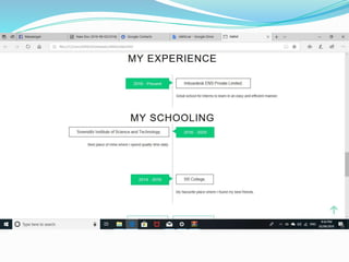 This document outlines the technologies used and skills learned to create a portfolio website. It lists the required technologies as Google Chrome, HTML, CSS, JavaScript, Bootstrap, jQuery and HTTP protocols. It details that the creator learned HTML completely as well as CSS and JavaScript basics. It acknowledges and thanks ImbueDesk company for providing courses that helped in building the portfolio website and improving skills.
