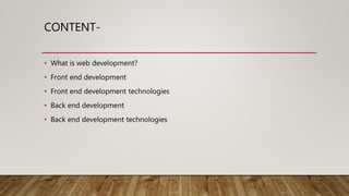 Web development involves both front-end development and back-end development. Front-end development includes using languages like HTML, CSS, and Bootstrap to define the layout and visual design of websites. Back-end development involves using languages like SQL and PHP to manage the database and functional aspects of websites that users do not see. Key front-end technologies are HTML for content, CSS for styling, and Bootstrap for responsive design. Key back-end technologies are SQL for databases and PHP for server-side scripting.