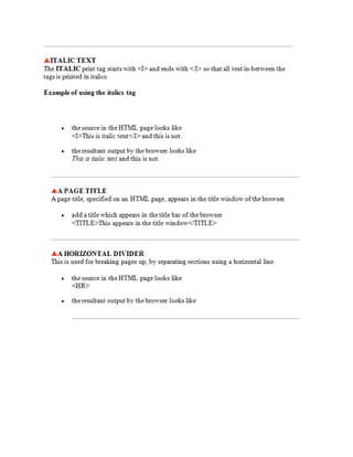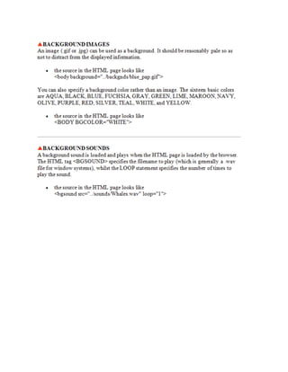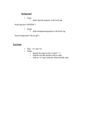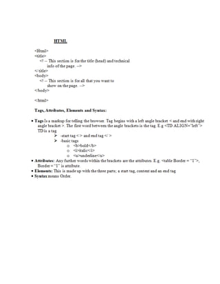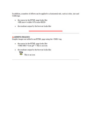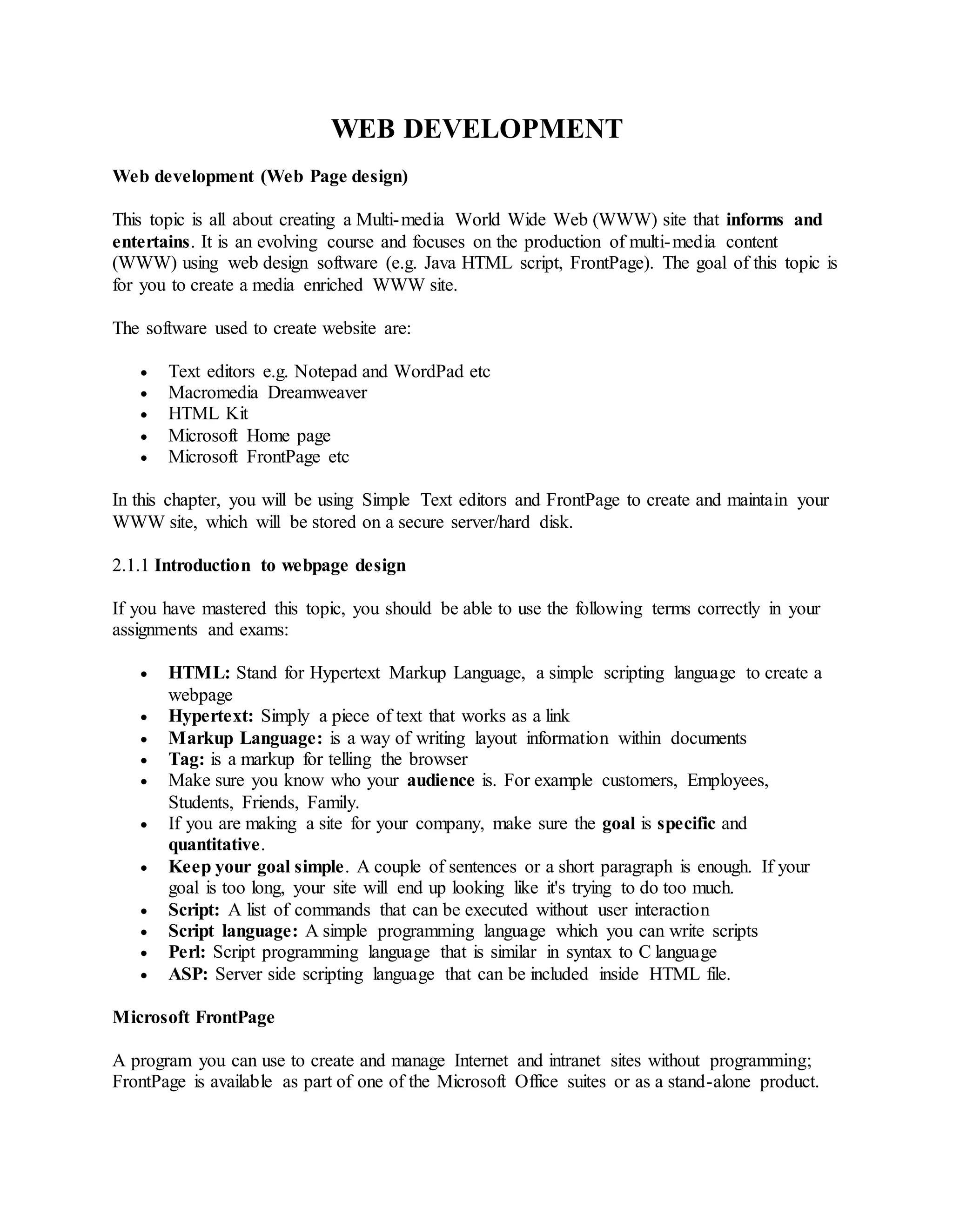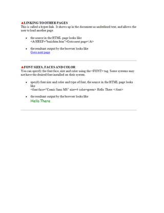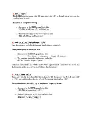 This document provides information about web development and creating webpages. It discusses using software like HTML, FrontPage, and text editors to design pages with headers, navigation bars, and common layouts. The document explains how to preview pages, publish them to a server so others can access the site, and the difference between a single webpage and an entire website. Key topics covered include HTML tags, page structure, outlining a site map, and hosting a site on an internal or external server.