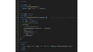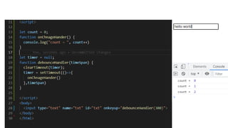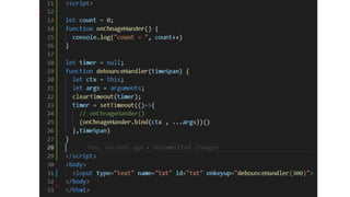 The document covers various JavaScript concepts including call, apply, and bind methods, debouncing, throttling, function currying, and event handling techniques. It explains how to optimize performance through these techniques, discusses asynchronous script loading, event bubbling, prototypal inheritance, and the CORS protocol for resource sharing across origins. Additionally, it details the functionality of iterators and generators in JavaScript.