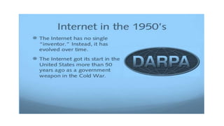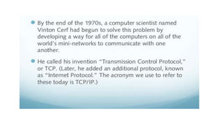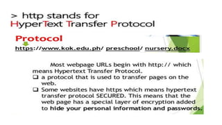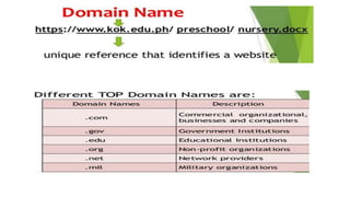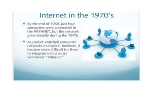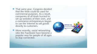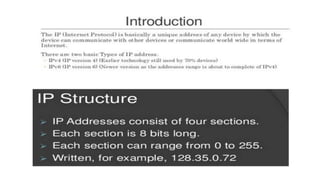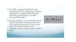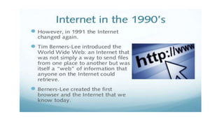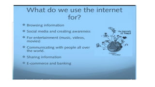 The document provides an overview of the internet and its services, explaining its significance in daily life and various functionalities such as communication, information retrieval, and online interactions. It describes elements like IP addresses, domain names, and the World Wide Web (WWW), detailing their structures and functions. Additionally, it outlines the history and evolution of the web, emphasizing its role in facilitating global connectivity and commerce.