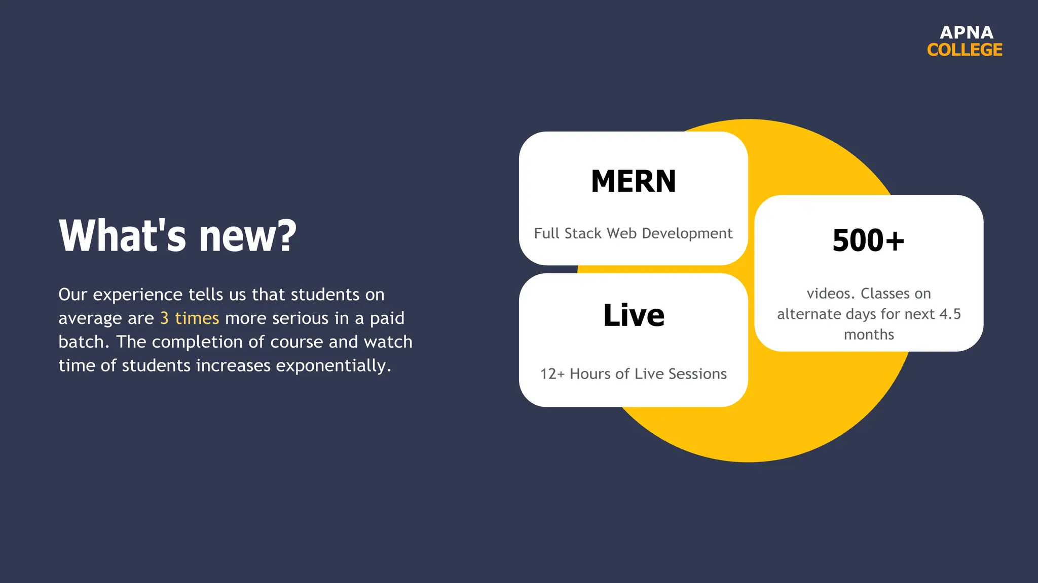 The document outlines a full stack web development course utilizing the MERN stack (MongoDB, Express, React, Node.js) offered by Apna College, consisting of over 500 videos and 12+ hours of live instruction over 4.5 months. It covers topics from frontend and backend development to databases, with a focus on real-life projects and industry skills, alongside practical job preparation guidance. The course begins on June 7, 2023, and emphasizes a hands-on learning approach with extensive use of live sessions and video resources.