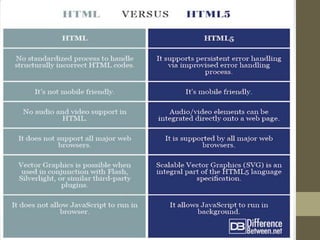The document outlines topics related to web development including introductions to HTML, CSS, XML, JSON, and other web technologies. It discusses internet infrastructure, the world wide web, and how websites are planned and designed. The document also provides an outline and overview of key elements of HTML like headings, paragraphs, colors, fonts, links, and images.