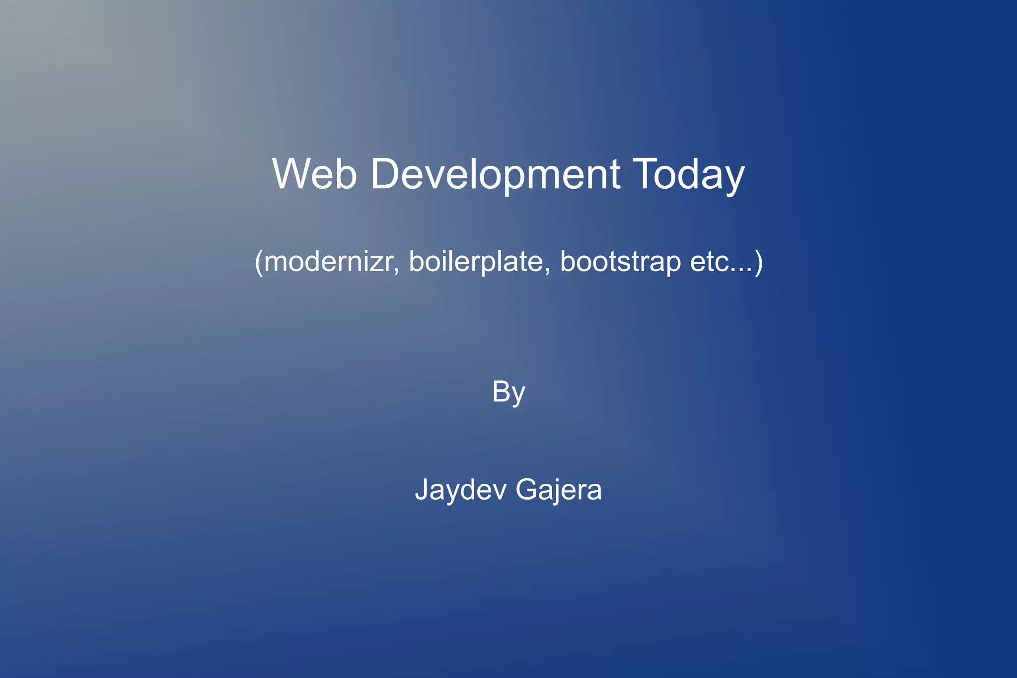 The document discusses HTML5 Boilerplate, which is a popular front-end template that helps developers build fast, robust, and adaptable web apps or sites. It includes tools like Modernizr, which detects HTML5 and CSS3 browser support, and HTML5 Shiv, which allows styling of HTML5 elements in older IE browsers. Using HTML5 Boilerplate follows best practices for performance, like minifying code and setting the viewport.