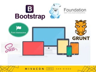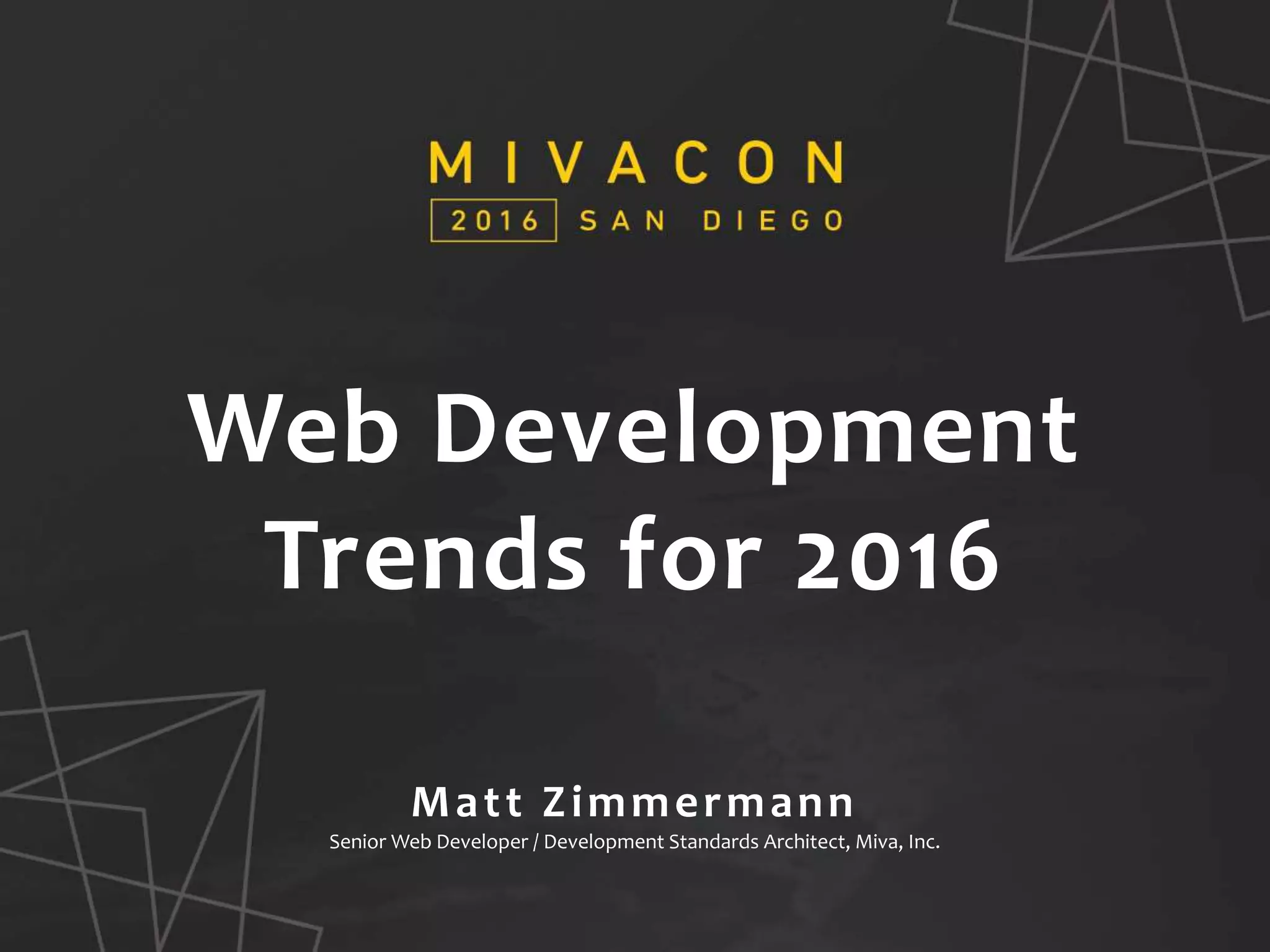 The document presents a session on web development trends for 2016, led by Matt Zimmermann, highlighting key trends such as hamburger menus, long-scroll sites, and card layouts. It emphasizes the importance of accessibility, quick page loads, and the adoption of new technologies. The session also includes links to slides and image credits relevant to the presentation.
