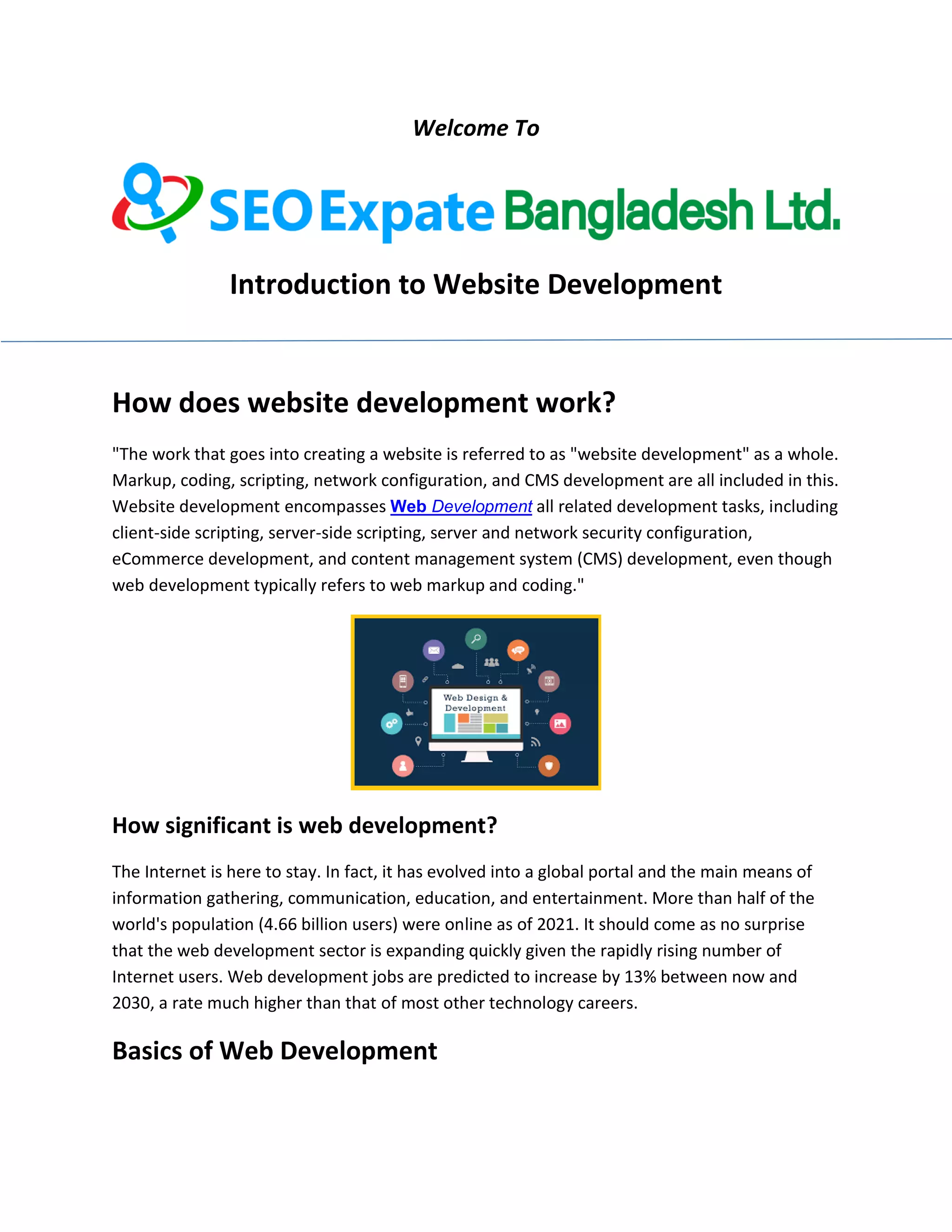 The document provides an introduction to website development, explaining its significance, fundamental principles, and various development styles such as front-end, back-end, and full-stack development. It discusses the importance of cybersecurity and outlines the web development process from planning to execution, along with resources for learning and community engagement in web development. Additionally, it highlights the expected growth in the web development job market due to the increasing number of internet users.