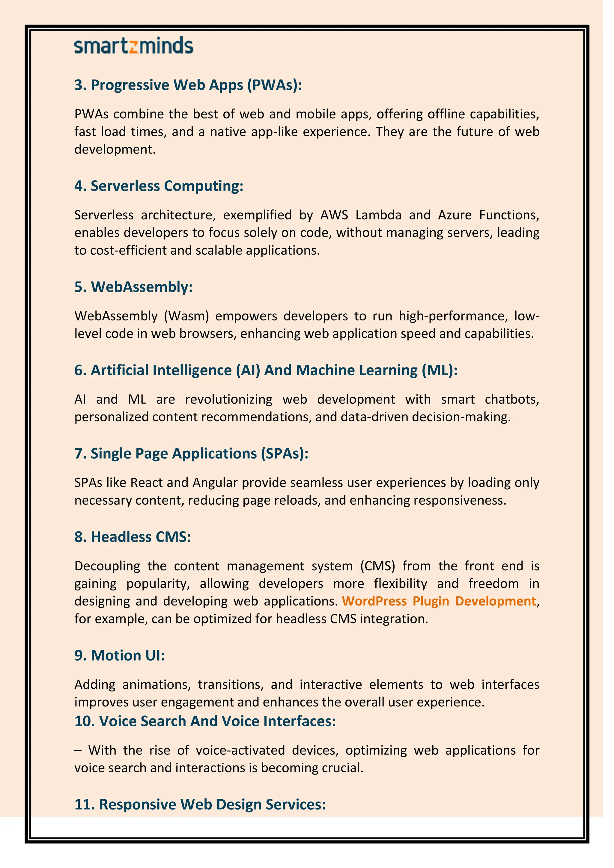 The document discusses 15 emerging technologies that are shaping the future of web development, highlighting the importance of full-stack and back-end development, as well as advancements such as progressive web apps (PWAs) and serverless computing. Additional topics include the relevance of AI, machine learning, responsive design, and cybersecurity, underscoring the necessity for developers to stay informed about these trends to remain competitive. Embracing these technologies is crucial for web developers to keep their skills relevant and ensure project success in a rapidly evolving digital landscape.