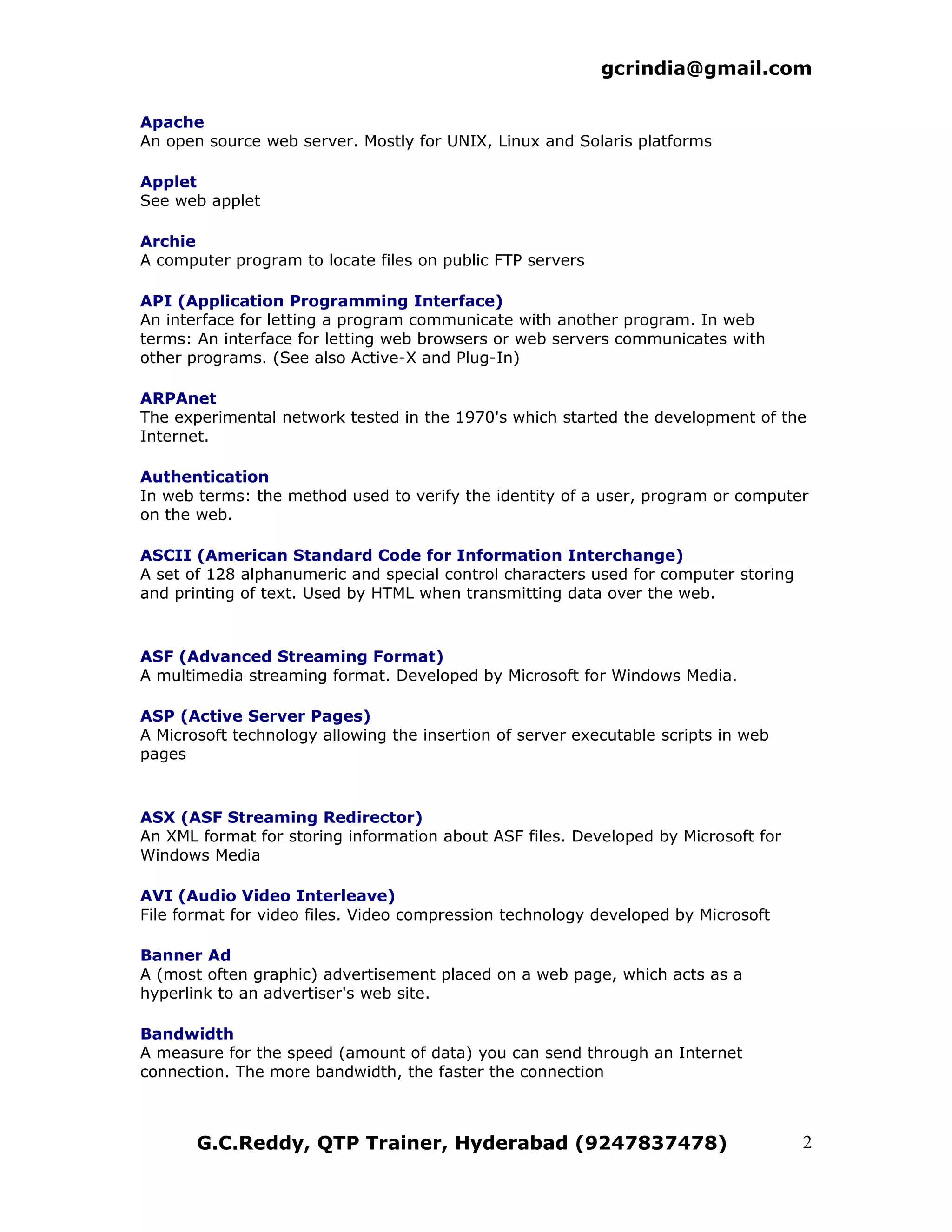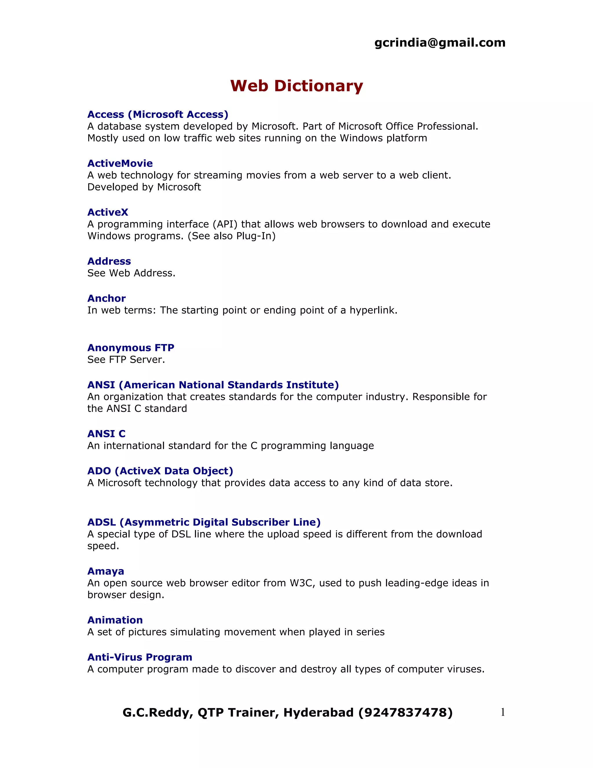 The document defines various technical terms related to web development and computing. It provides definitions for terms like ActiveMovie, ActiveX, Address, Anchor, Anonymous FTP, ANSI, and ADO among many others. Each term is defined in 1-2 sentences to concisely explain its meaning or purpose.