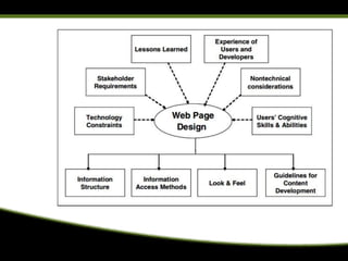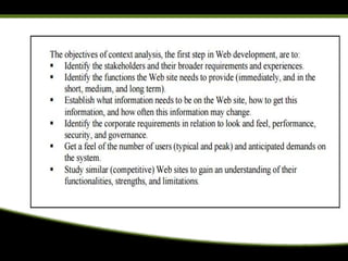 This document outlines the key steps in the web development process: context analysis, architecture design, web page design, and web maintenance. It discusses each step in detail. Context analysis is about understanding requirements, users, and the environment. Architecture design determines technical components and how they are linked. Web page design focuses on user needs and usability. Web maintenance includes updating content and systems over time as requirements evolve. The overall process aims to develop measurable and trackable web-based systems that meet user needs.