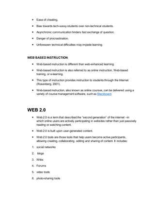 This document discusses web-enhanced learning and online collaboration tools. It defines web-enhanced learning as using internet technology to create student-centered learning environments. Oliver et al. organized web-enhanced learning into four categories: information access, networked instruction, interactive learning, and materials development. Some key advantages of web-enhanced learning include improved access to education, better integration for non-full time students, and acquisition of technological skills. The document also discusses online collaboration tools like blogs, forums, wikis, media galleries, and Skype that can be used to facilitate collaboration.