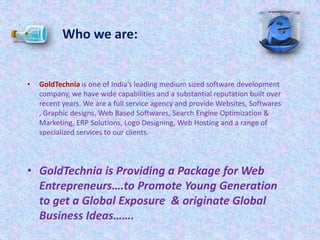 Goldtechnia is a leading software development company in India offering a package for web entrepreneurs to foster global business ideas among the youth. The document discusses the rise of internet usage and the necessity of having a website for individuals across various professions to enhance visibility and generate income. It also outlines the training and web services provided by Goldtechnia, including domain registration, web hosting, SEO, and support for building and optimizing websites.