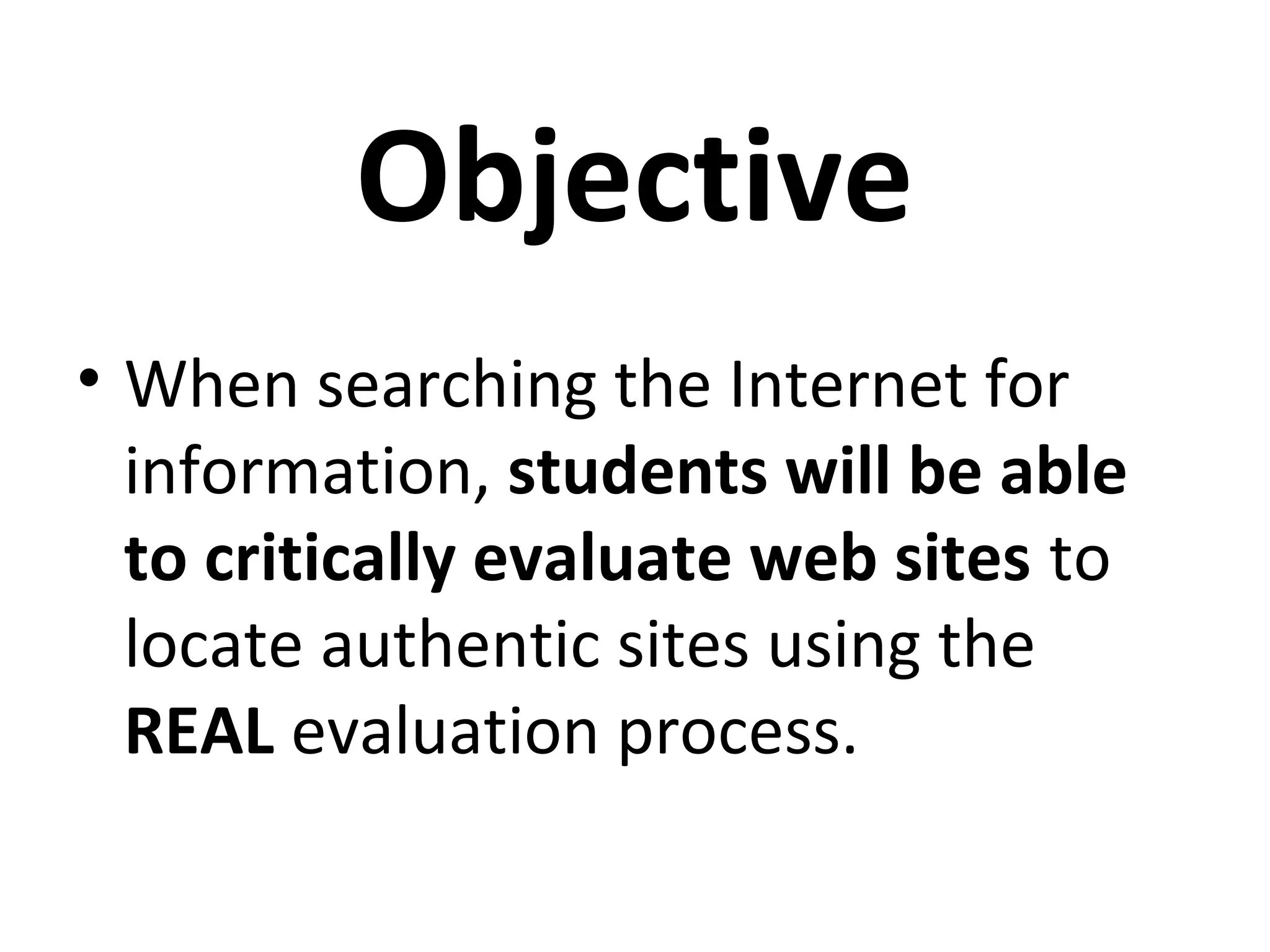 Students are instructed to apply the REAL criteria to critically evaluate websites and locate authentic information for research. Examples are provided to demonstrate how to analyze URLs, content, authors and links.