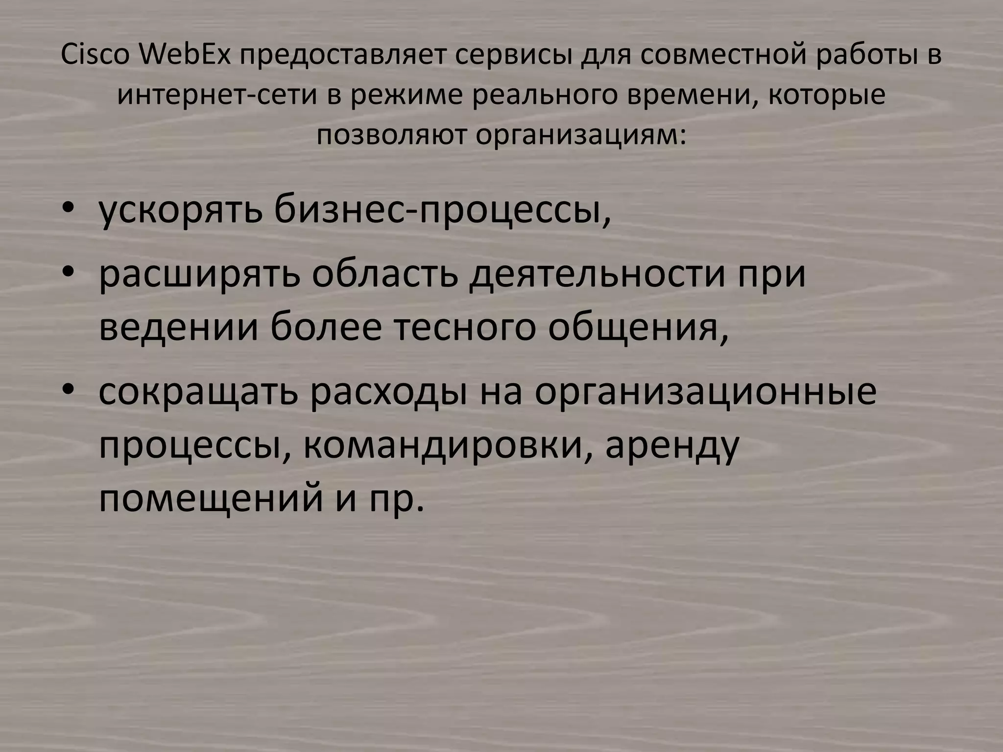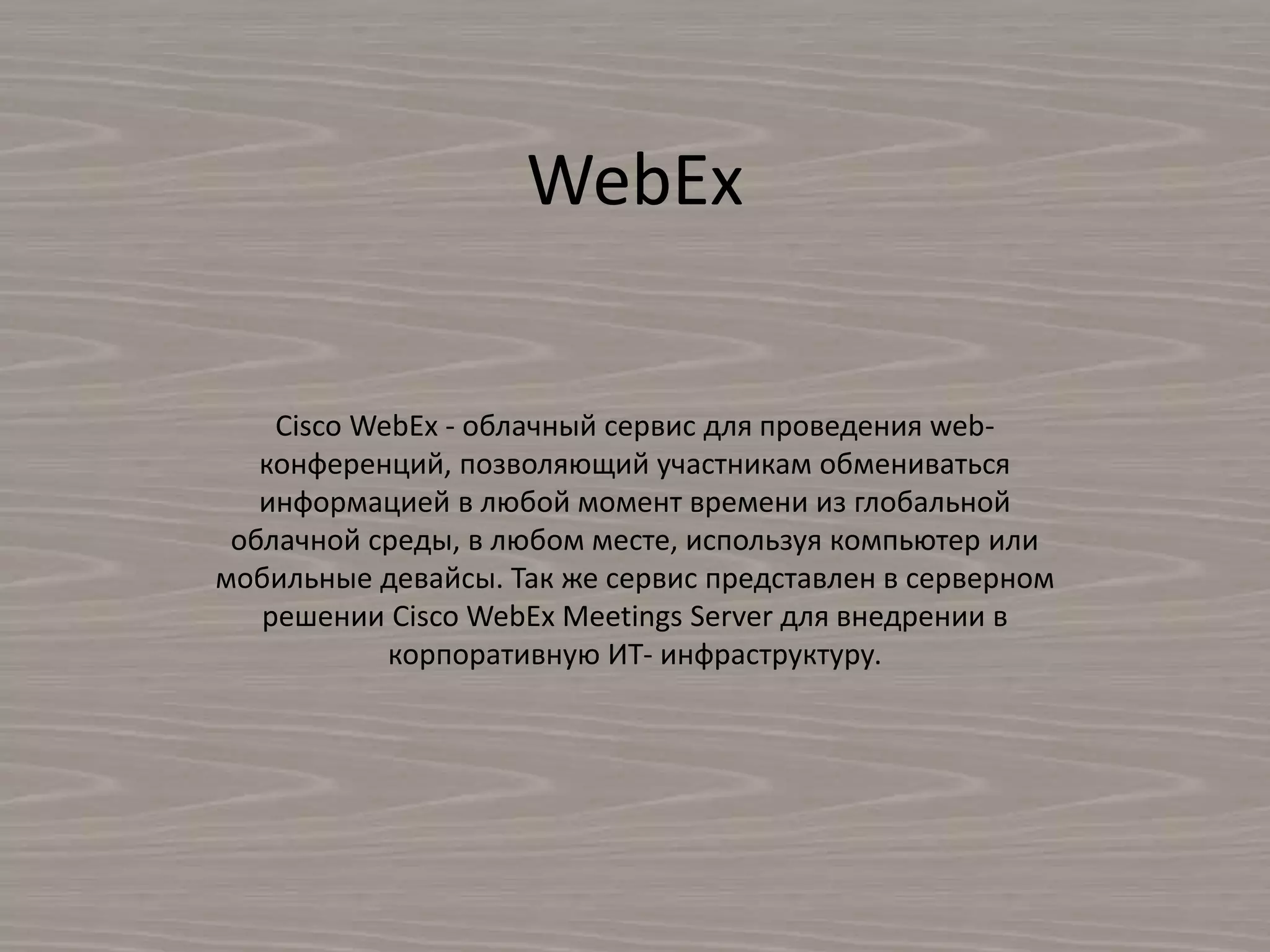 Cisco Webex – облачный сервис для проведения веб-конференций, обеспечивающий обмен информацией и совместную работу в реальном времени. Он предлагает различные решения для встреч, обучения и технической поддержки, включая возможность брендирования микросайтов для компаний. Cisco Webex также обеспечивает высокую безопасность и гибкость в использовании, позволяя участникам подключаться из любой точки мира.
