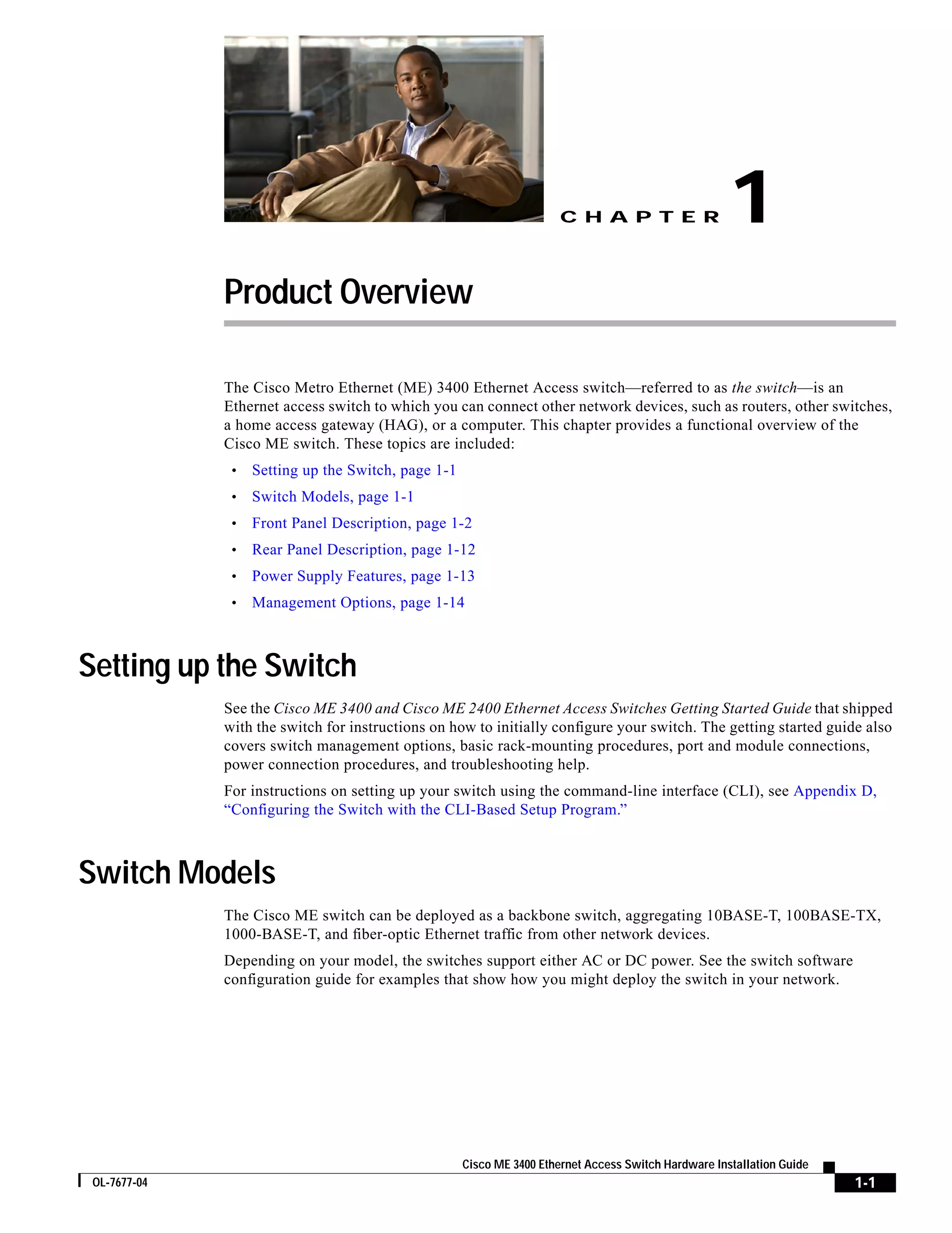 The document provides an overview of the Cisco Metro Ethernet (ME) 3400 Ethernet Access Switch, detailing its features, models, and operational setup. It includes information on the switch's front and rear panel descriptions, power supply options, and configuration details for various ports. Instructions for management options and initial configuration are also referenced, emphasizing the versatility of the switch in network deployment.
