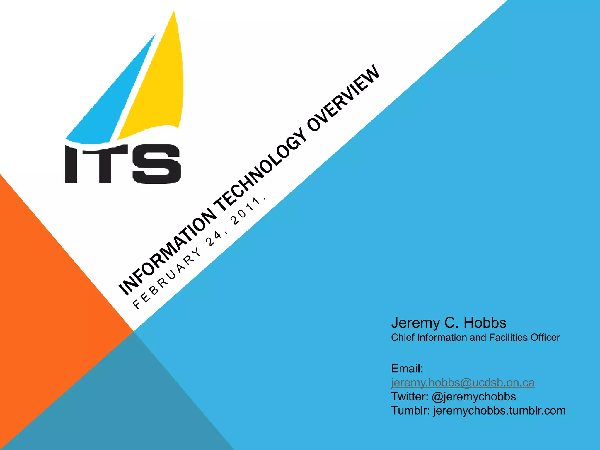 Jeremy Hobbs, the Chief Information and Facilities Officer at UCDSB, presented an overview of the IT department and its strategic goals. The IT department supports over 10,000 computers across 100 locations with only 17 staff members. Some of its key responsibilities include supporting the student information system, email servers, websites, and a large private wide area network. Looking ahead, the department aims to increase personalization, mobility, and cloud services while standardizing infrastructure and automating non-essential tasks to improve efficiency with limited resources. The presentation also addressed the department's web filtering strategy and plans to differentiate policies based on user identity and age.