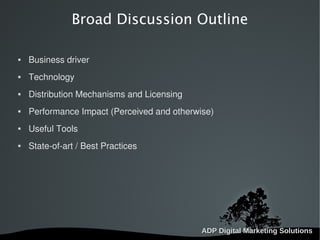 This document discusses web fonts, including the business drivers for using them, the supporting technologies, distribution mechanisms and licensing options, performance impacts, useful tools, and best practices. It notes that web fonts allow approved typefaces from companies and are brought in as an opt-in feature. While the <font-face> CSS feature has existed since IE4, different formats like TTF, OTF, EOT, WOFF and SVG require support. Distribution includes hosting on websites, CDNs, or third-party services, while licensing models include commercial and free options. Performance impacts include additional HTTP requests, blocking rendering, and perceived slowness. Tools aid optimization, subsetting, and conversion between formats. Caching, compression,