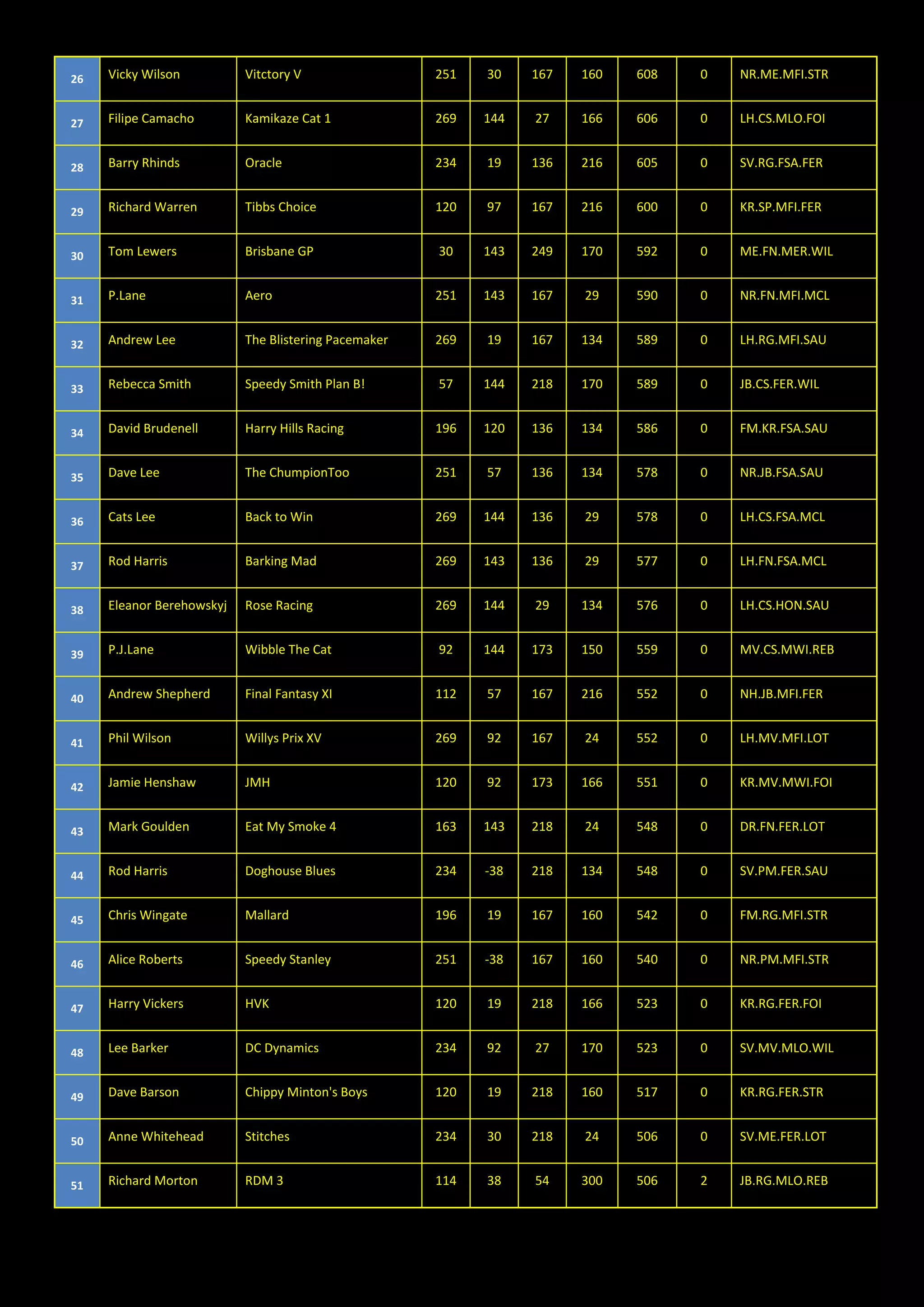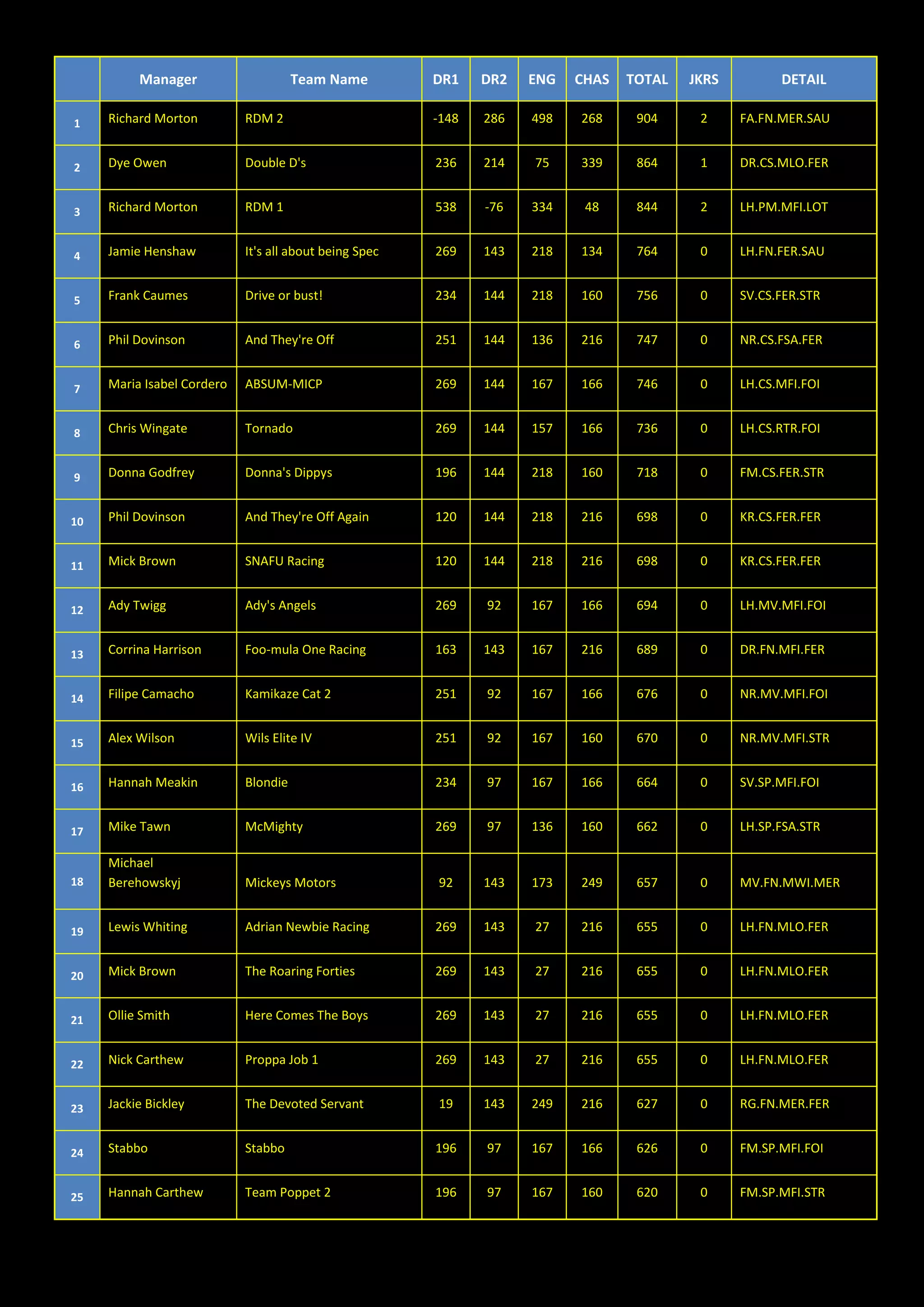 This document provides team standings from a racing competition. It lists 117 teams with their manager name, total points scored, and details on their car classification and specialization. The top team, managed by Richard Morton, scored 904 points in class FA.FN.MER.SAU.