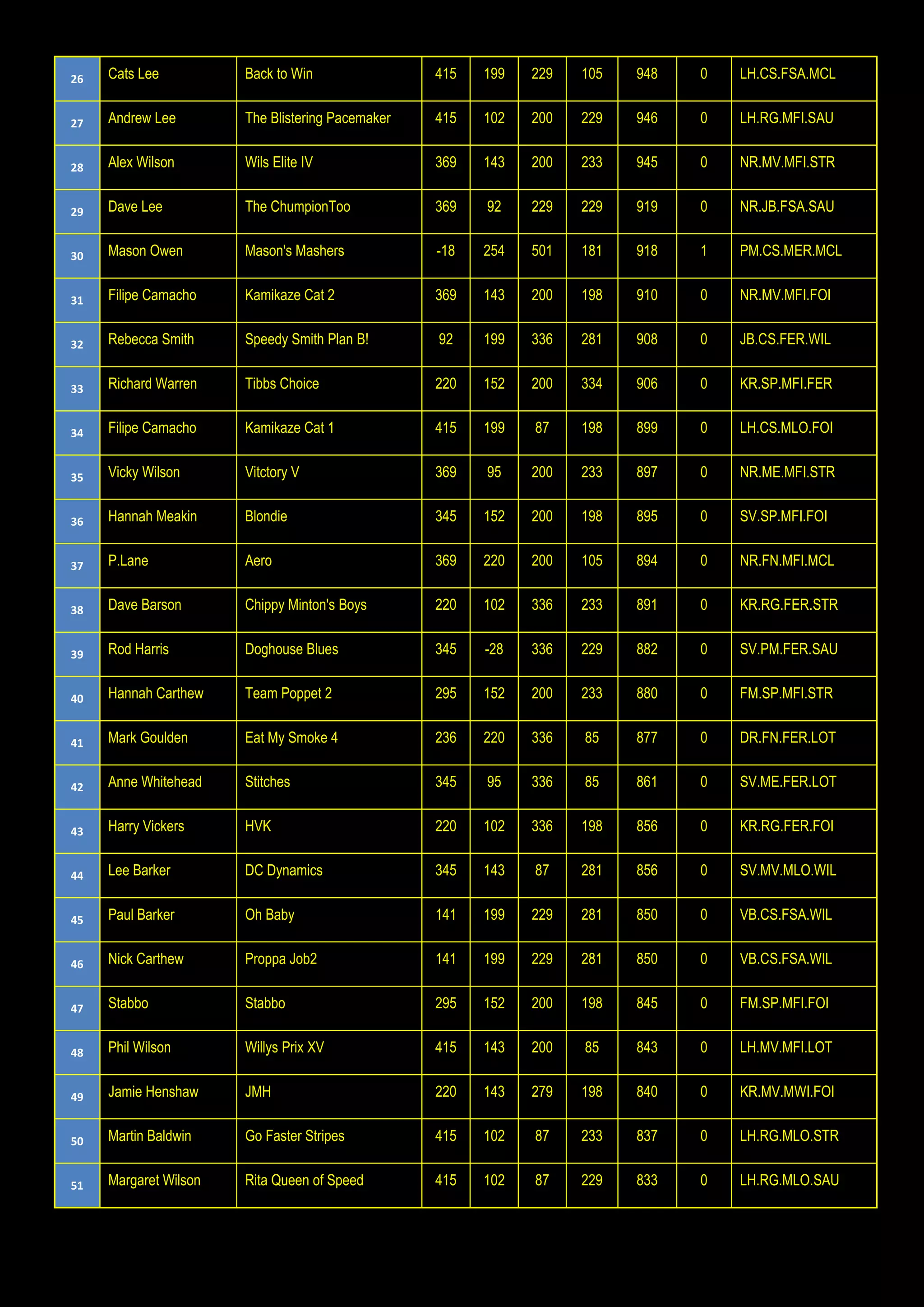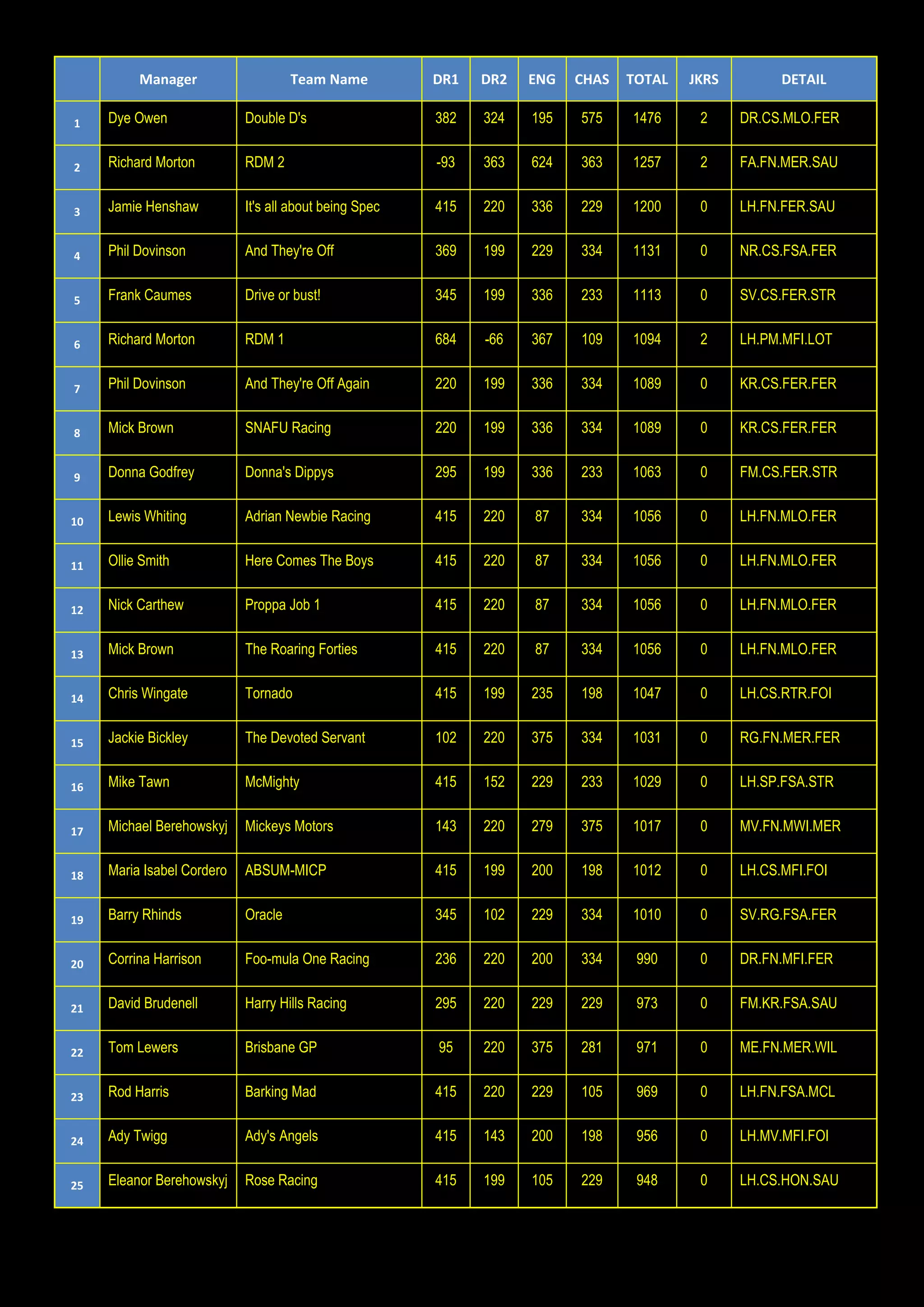 The document appears to be a ranking of 117 racing teams across various manager teams and drivers, listing details like total points scored, driver initials, and team details. It includes the team name, total points scored, top driver's initials and details, and ranking. The table provides overview statistics on multiple racing metrics for over 100 manager teams and their drivers for the season.