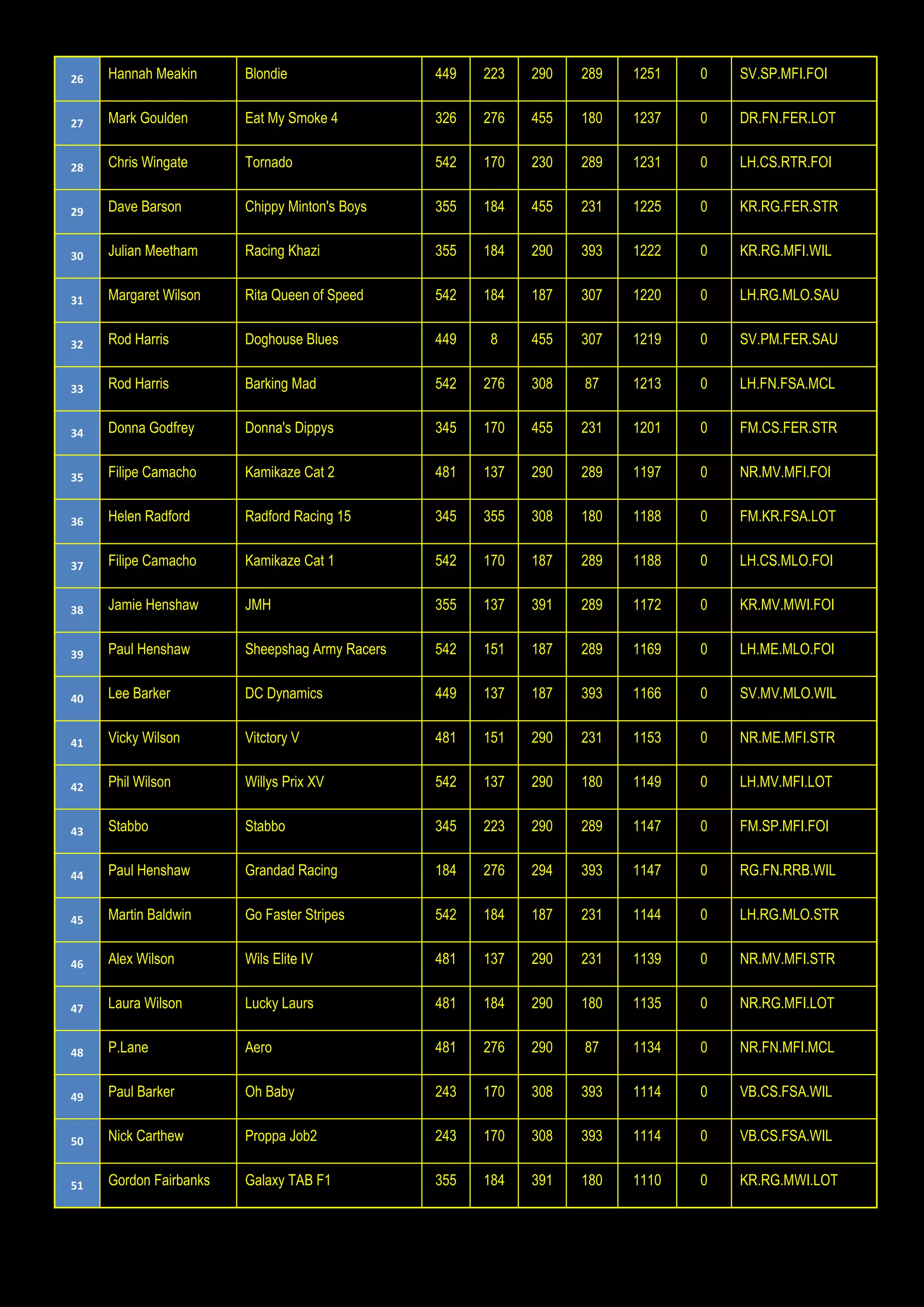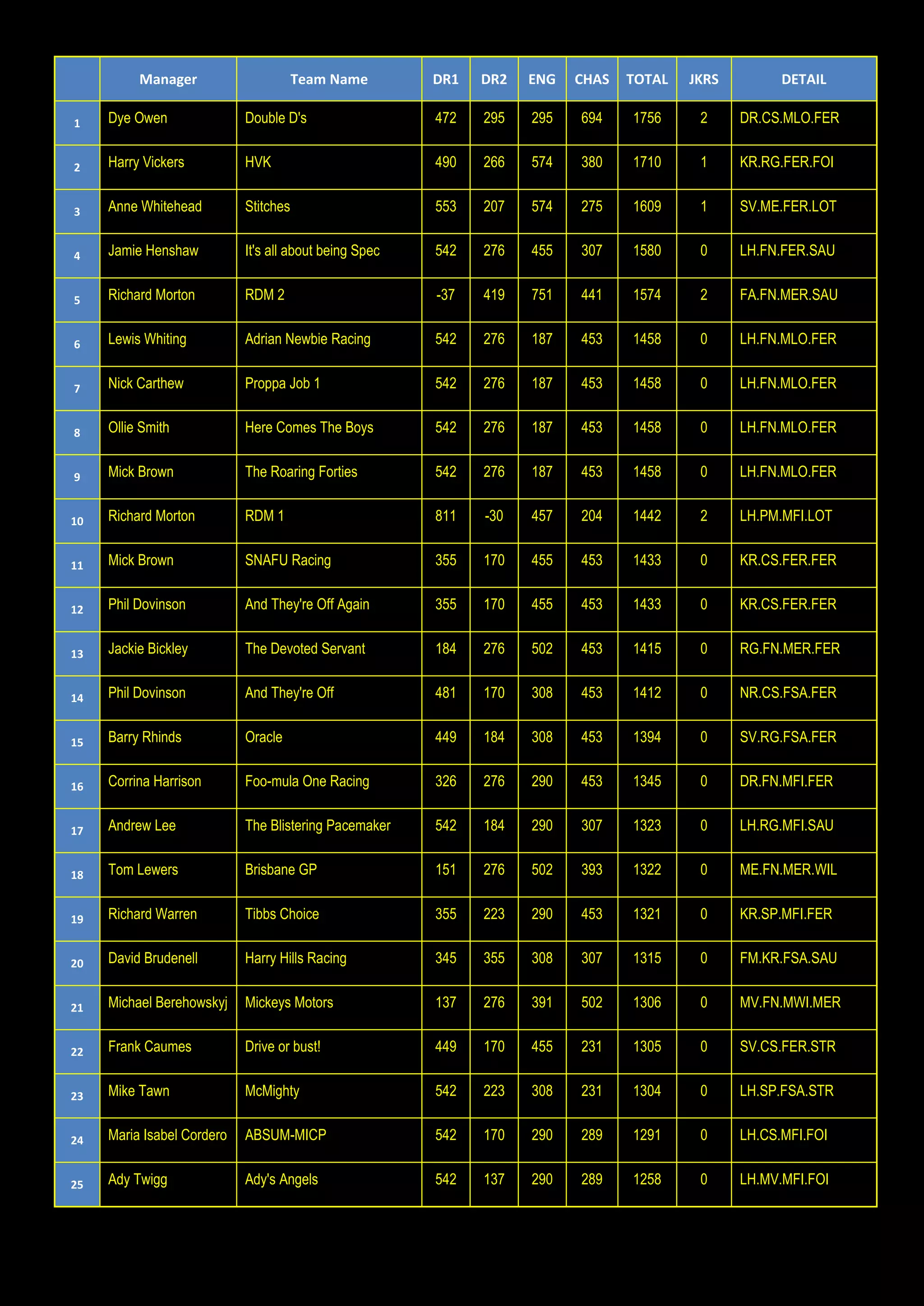 The document appears to be a table listing manager team names, driver details, and scoring information for over 100 racing teams. It includes columns for driver names, scores in different categories, total points, and other identifying details. The wide variety of team names, drivers, and scores listed suggests this table contains statistics compiled from a racing league or series involving many competing managers and teams.