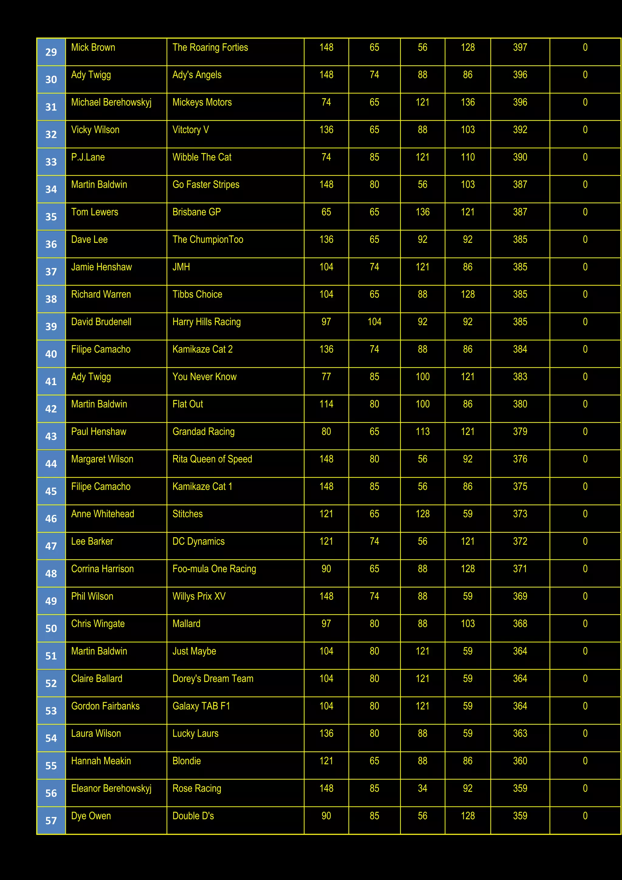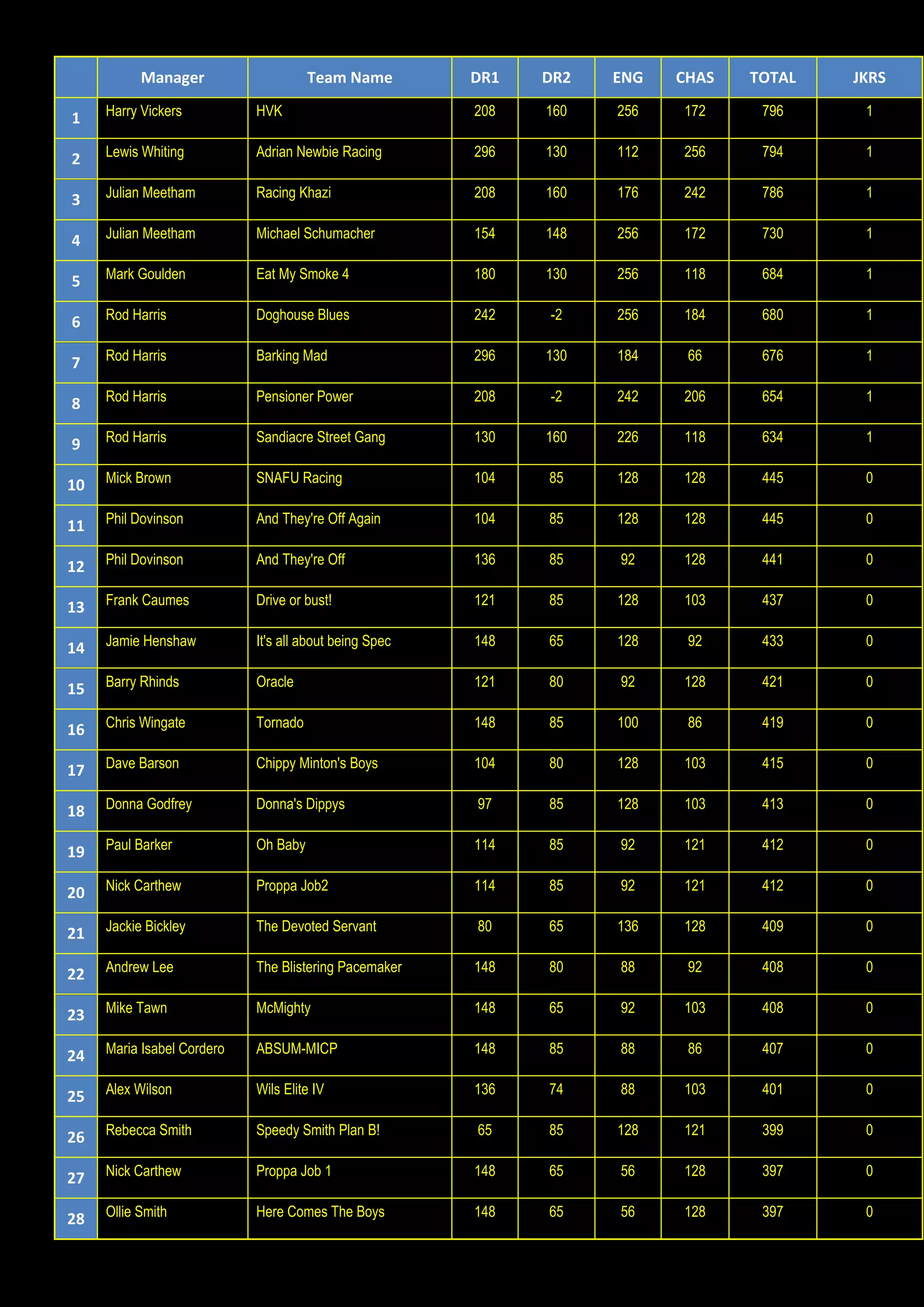 The document appears to be a table listing manager team names and their total points in a racing competition. It shows the top manager was Harry Vickers of team HVK with 796 total points. Lewis Whiting of Adrian Newbie Racing was second with 794 total points. Julian Meetham placed third with two separate teams, Racing Khazi with 786 points and Michael Schumacher with 730 points.