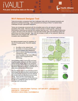The document discusses a Wi-Fi Network Designer tool developed by Pacific Alliance Technologies to help telecommunication companies address challenges from increased wireless data usage. The tool allows users to design and cost potential Wi-Fi network expansions using existing infrastructure like poles. It factors in how different technologies would distribute coverage and impact network load, performance, costs and client satisfaction.
