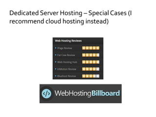 Dedicated servers are the most expensive web hosting option as they require purchasing an actual computer in the datacenter. While dedicated servers used to provide ultimate performance and reliability through total control, they are being replaced by cloud hosting which provides high performance, reliability, and scalability at a lower cost by allowing resources to be adjusted on demand. For web hosting, the document recommends choosing cloud hosting over dedicated servers.