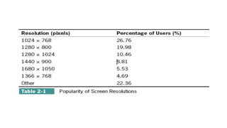 This document discusses trends in web interface design and elements of effective design. It outlines trends like longer scrolling sites, storytelling/interaction, simplicity, and large typography. It also covers web components like responsive design for multiple screen resolutions. The document details elements of good design like simplicity, consistency, identity, useful content, and navigation. It discusses site structure models and layout. Finally, it provides an assignment to design an e-commerce site using tools like Photoshop.