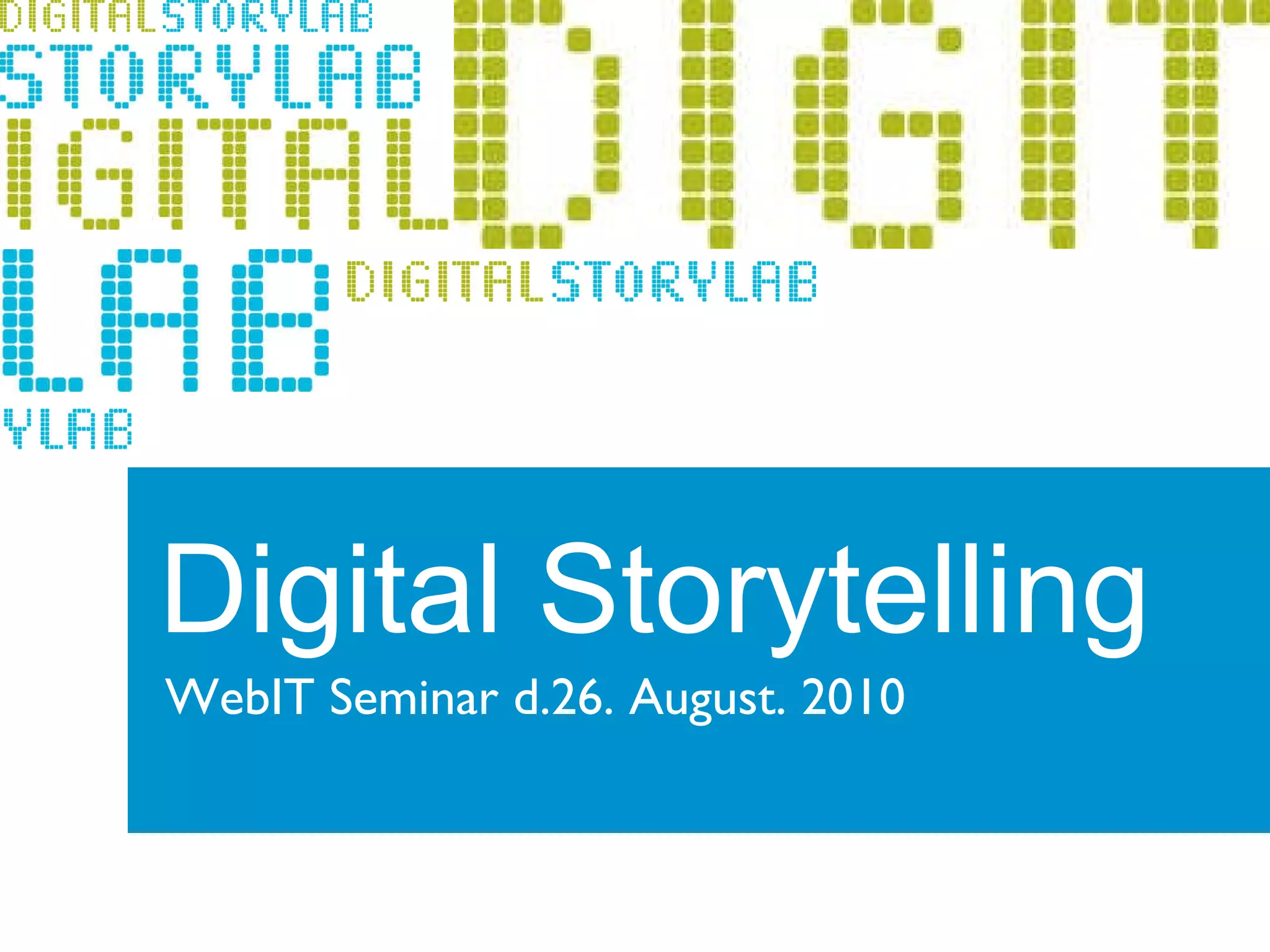 Hvem er vi?StoryLab har kontor og computerlab på Frederiksberg i København – CBS. Vi kommer fra bla. IT universitetet, CBS samt har tilknyttet en række freelancere og filmfolk Vi er uddannet af Joe Lambert i Berkely – Storycenter.org Mission: At udbrede kendskabet til Digital Storytelling i Danmark og give folk en personlig stemme i de nye medier.