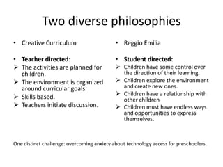 Two preschools, one using the Creative Curriculum model and one using the Reggio Emilia model, transformed their curriculum to incorporate more technology. At the Creative Curriculum school, students used iPads to scan personalized barcodes to find their seats at snack time, then expanded the project to go on scavenger hunts around the school. At the Reggio Emilia school, students used iPads and book creation apps to make digital books about their families to share with their families and each other. Both schools found that the technology engaged students and teachers, increased skills, and helped bridge the gap between home and school.