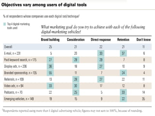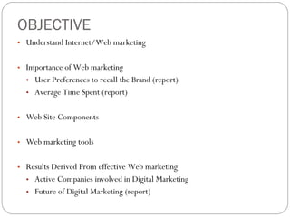 The document discusses the significance of web marketing, highlighting user preferences and the importance of effective communication between brands and users. It categorizes various web marketing tools, such as search engine optimization, social media marketing, and email marketing, while outlining website components and strategies for corporate branding. The document emphasizes the need for interactive and informative platforms to engage users and enhance brand presence in the digital landscape.