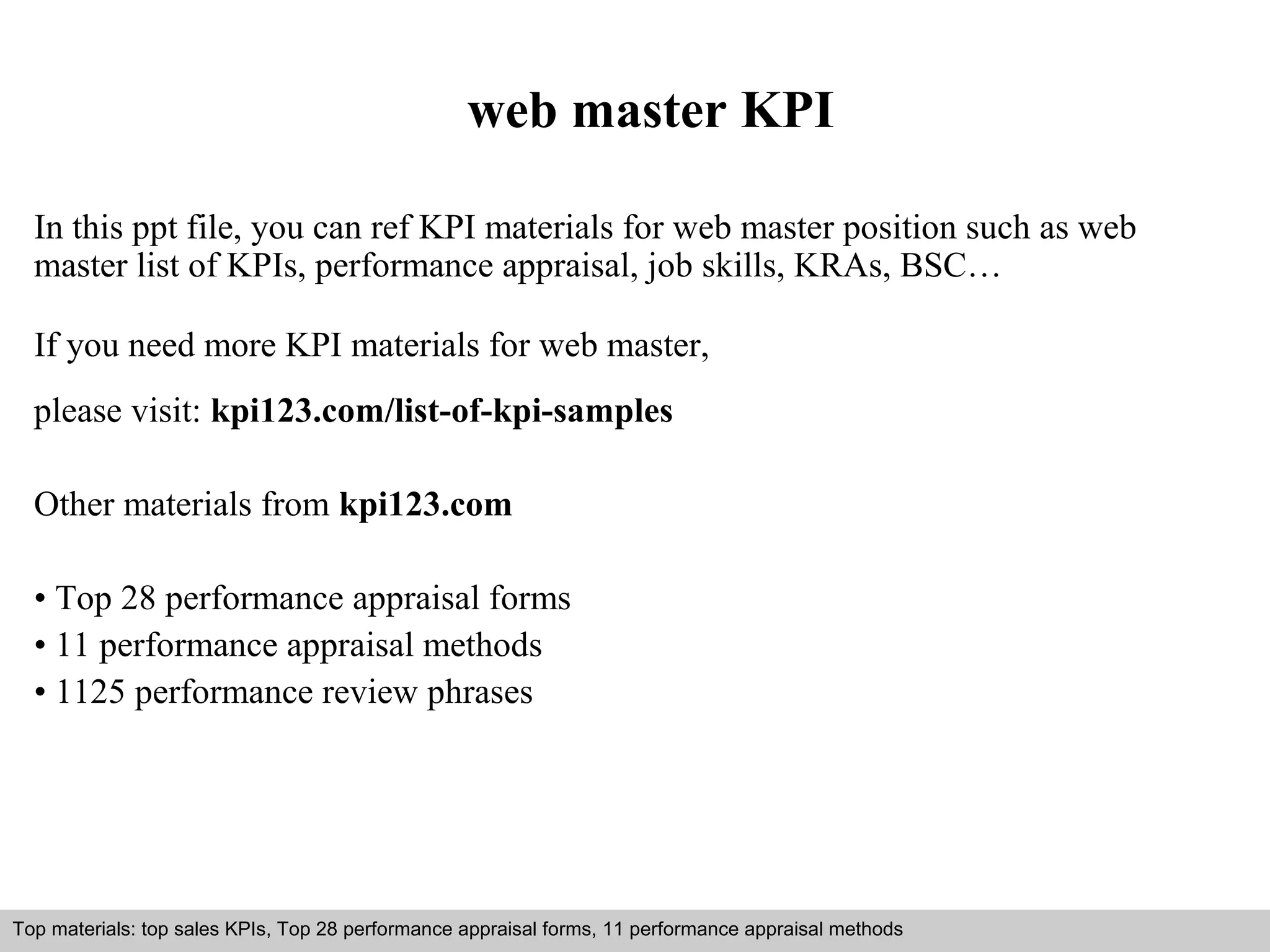 This document discusses key performance indicators (KPIs) for the role of a web master. It provides examples of KPIs, outlines steps for creating KPIs for a web master position, discusses common mistakes in developing KPIs, and how to design effective KPIs linked to strategy and goals. The document recommends visiting kpi123.com for additional KPI samples, performance appraisal forms, review methods and phrases to help evaluate a web master's performance.
