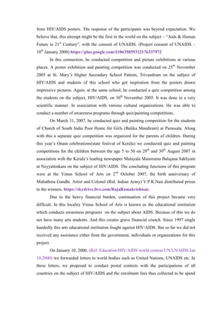 Mr. Raja has been conducting HIV/AIDS educational awareness programs for children and young people in India since 1998 through his art institution, Venus Arts Institute. This includes poster exhibitions, painting competitions, and quizzes to educate youth on HIV/AIDS. Due to financial constraints, he is seeking sponsors to help expand these programs worldwide through an online contest in order to both raise further awareness and collect funds to open rehabilitation centers for people severely affected by HIV/AIDS in different countries. He provides details on organizing such contests and the goals of educating youth and helping those impacted by the disease.