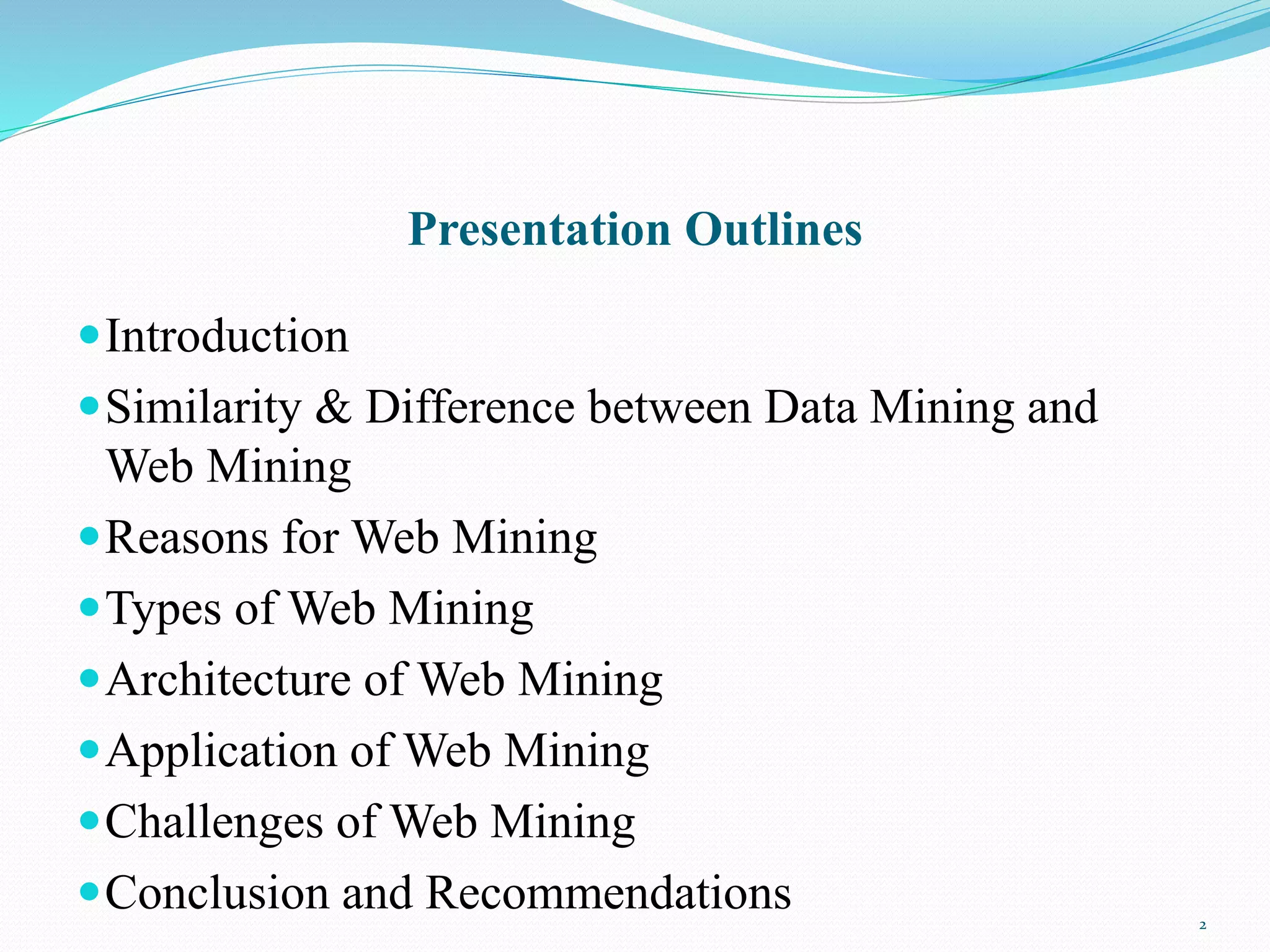 This document outlines a presentation on web mining. It begins with an introduction comparing data mining and web mining, noting that web mining extracts information from the world wide web. It then discusses the reasons for and types of web mining, including web content, structure, and usage mining. The document also covers the architecture and applications of web mining, challenges, and provides recommendations.