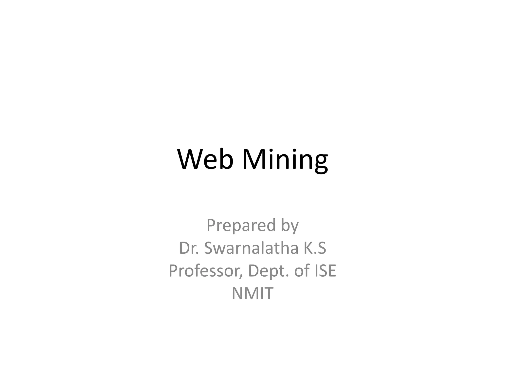 The document discusses web mining, which involves applying data mining techniques to extract useful information from the web. It describes the three types of web mining: web content mining of web page content, web structure mining of hyperlink structures, and web usage mining of web server logs to analyze user behavior patterns. Challenges of web mining include the complexity and dynamic nature of web data as well as diversity of users. Applications of web mining include marketing, data analysis, audience behavior analysis, and advertising campaign analysis.