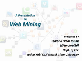 This document presents an overview of web mining techniques. It discusses how web mining uses data mining algorithms to extract useful information from the web. The document classifies web mining into three categories: web structure mining, web content mining, and web usage mining. It provides examples and explanations of techniques for each category such as document classification, clustering, association rule mining, and sequential pattern mining. The document also discusses opportunities and challenges of web mining as well as sources of web usage data like server logs.